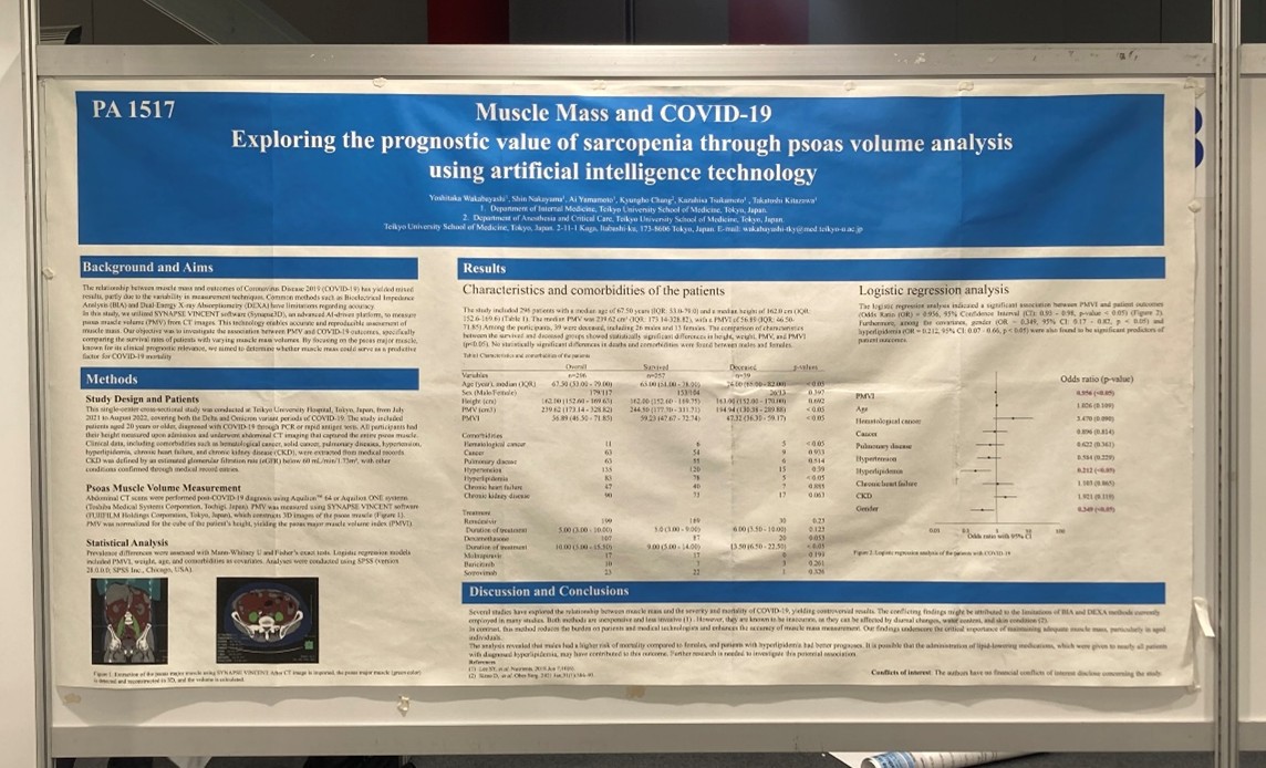若林先生が2024年9月にオーストリアのウィーンで行われた、European Respiratory Society Congress 2024で”Muscle Mass and COVID-19: Exploring the Prognostic Value of Sarcopenia through Psoas Volume Analysis using Artificial Intelligence Technology”について発表しました!