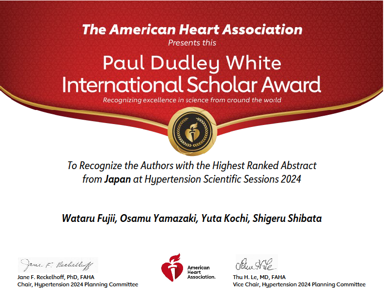 当研究室の発表がAHA Hypertension Paul Dudley International Scholar Awardを受賞しました。本学と東京医科歯科大学との共同研究の成果です!