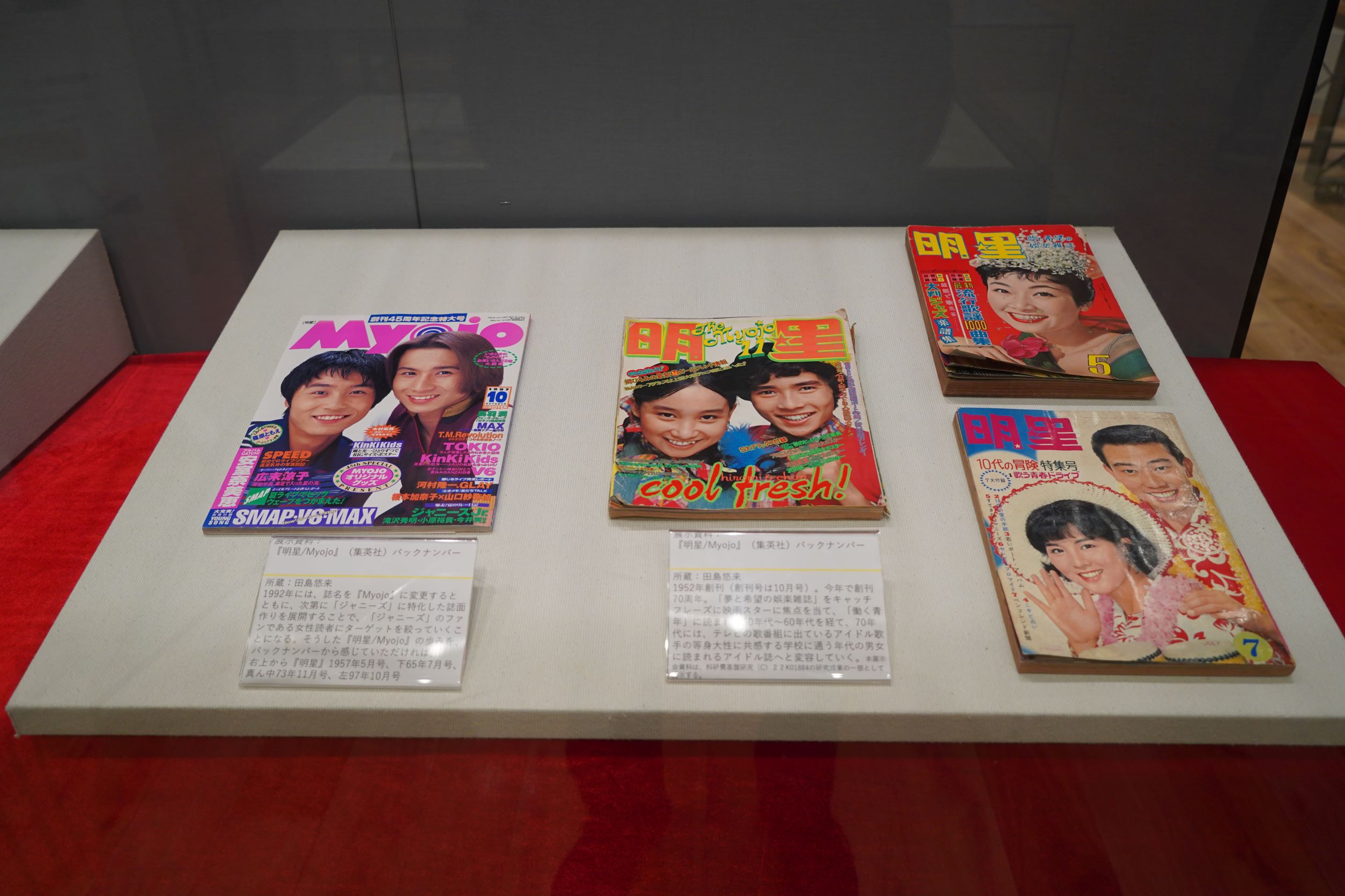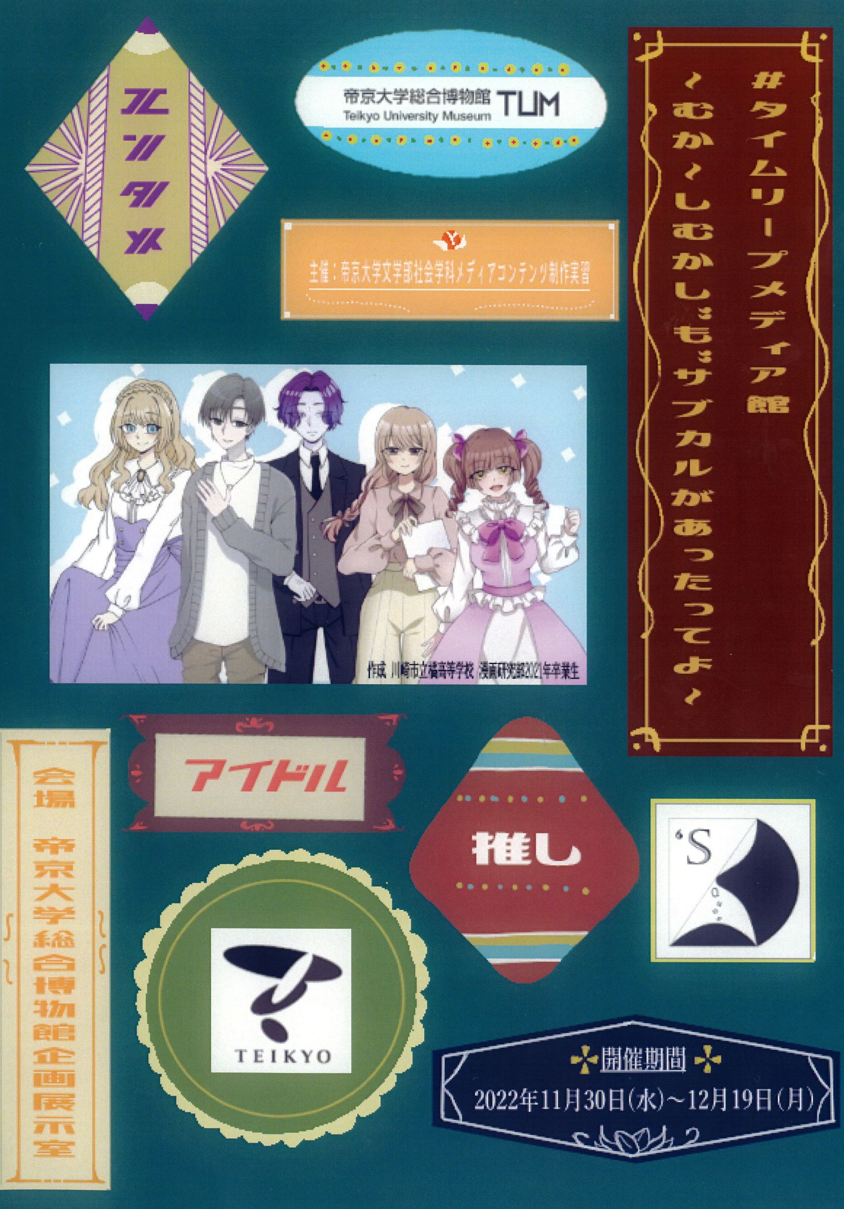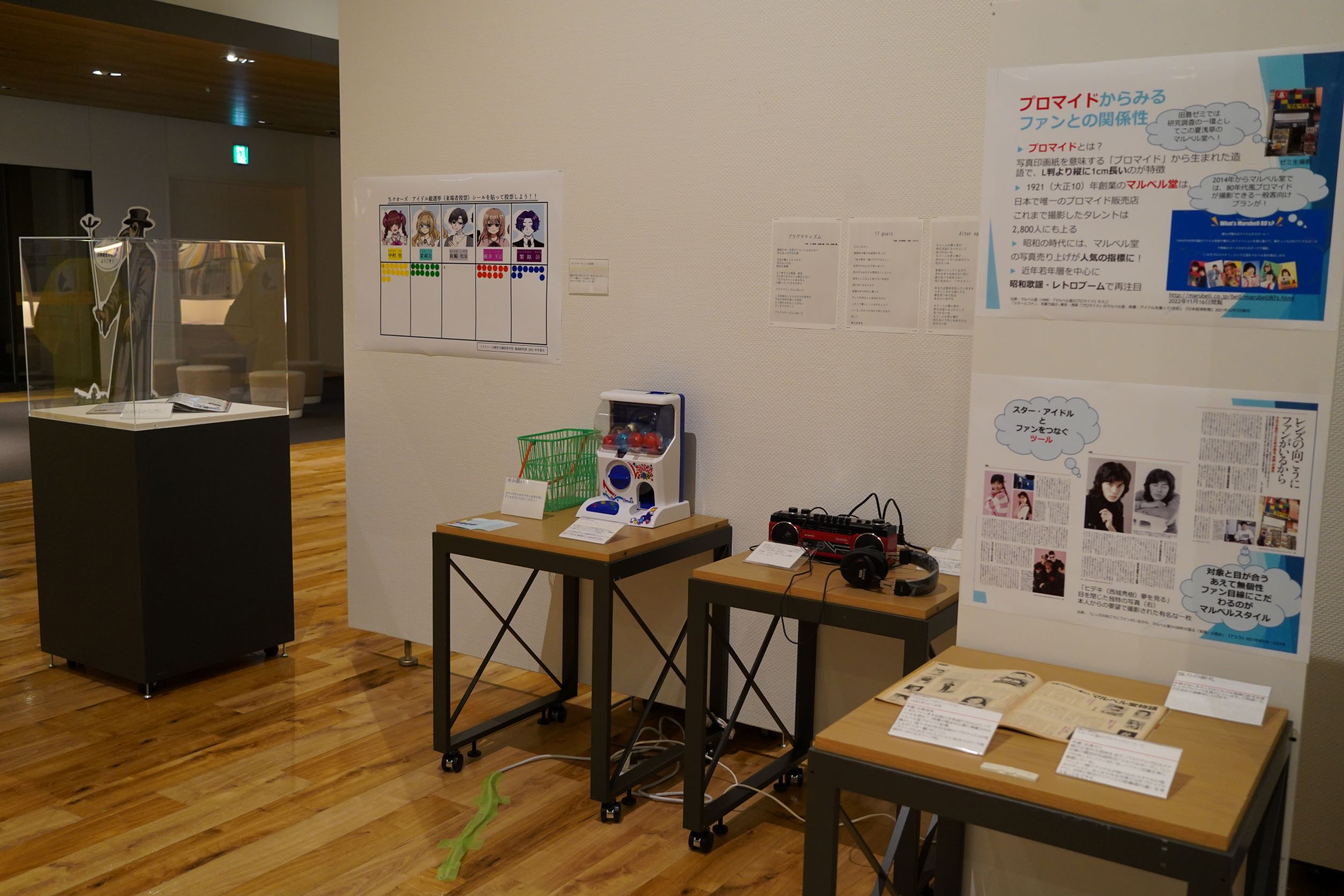 本展示会では、社会学科の2年生以上を対象とした科目「メディアコンテンツ実習(田島悠来 講師担当クラス)」の、まさにZ世代の受講生が中心となって、日本のメディア・エンターテインメントの歴史、特にはこうした現代にも続く「レトロなサブカル」が現れてくる1980年代以降の状況について、それぞれの関心に従って「ジャニーズのアイドル」「音楽」「アニメ」という三つの軸から雑誌メディアを素材にして紐解いていく研究・調査を実施し年表を作成、オリジナルの「アイドル」である「‘s(クォーズ)」を制作した成果を披露します。また、『明星』やプロマイドといった芸能関係の貴重な資料も現物展示しています。