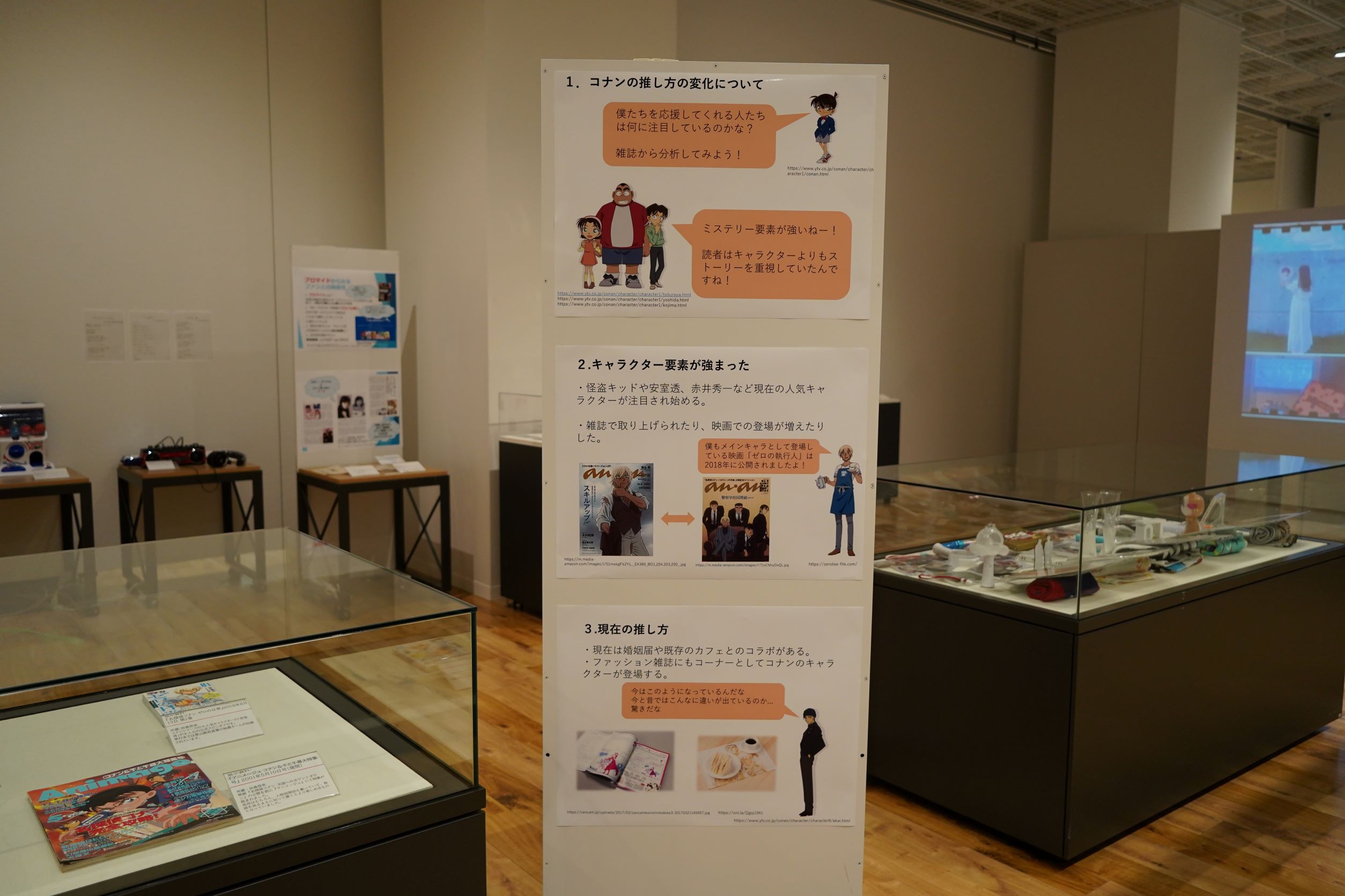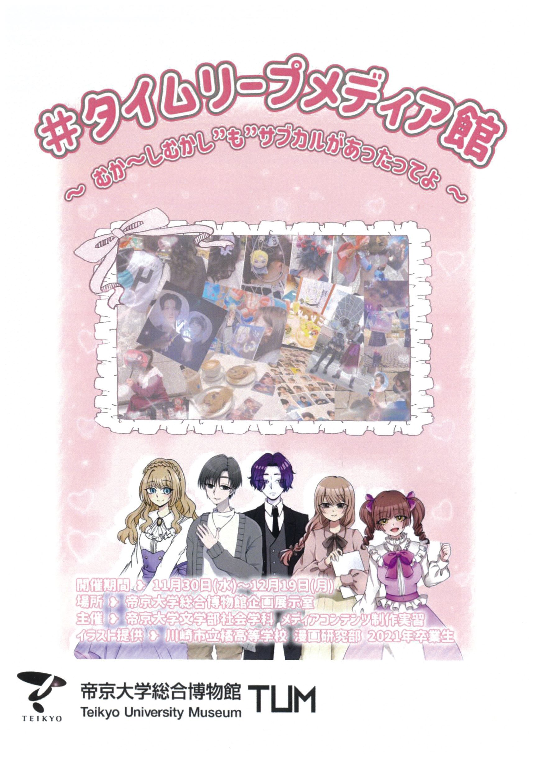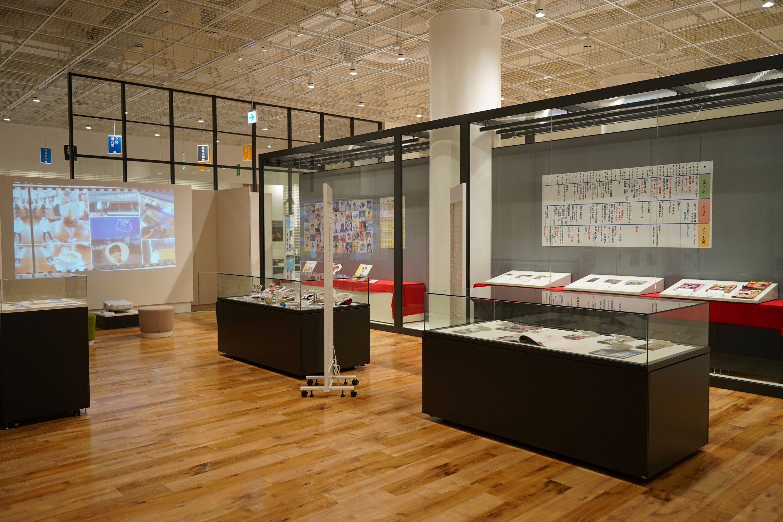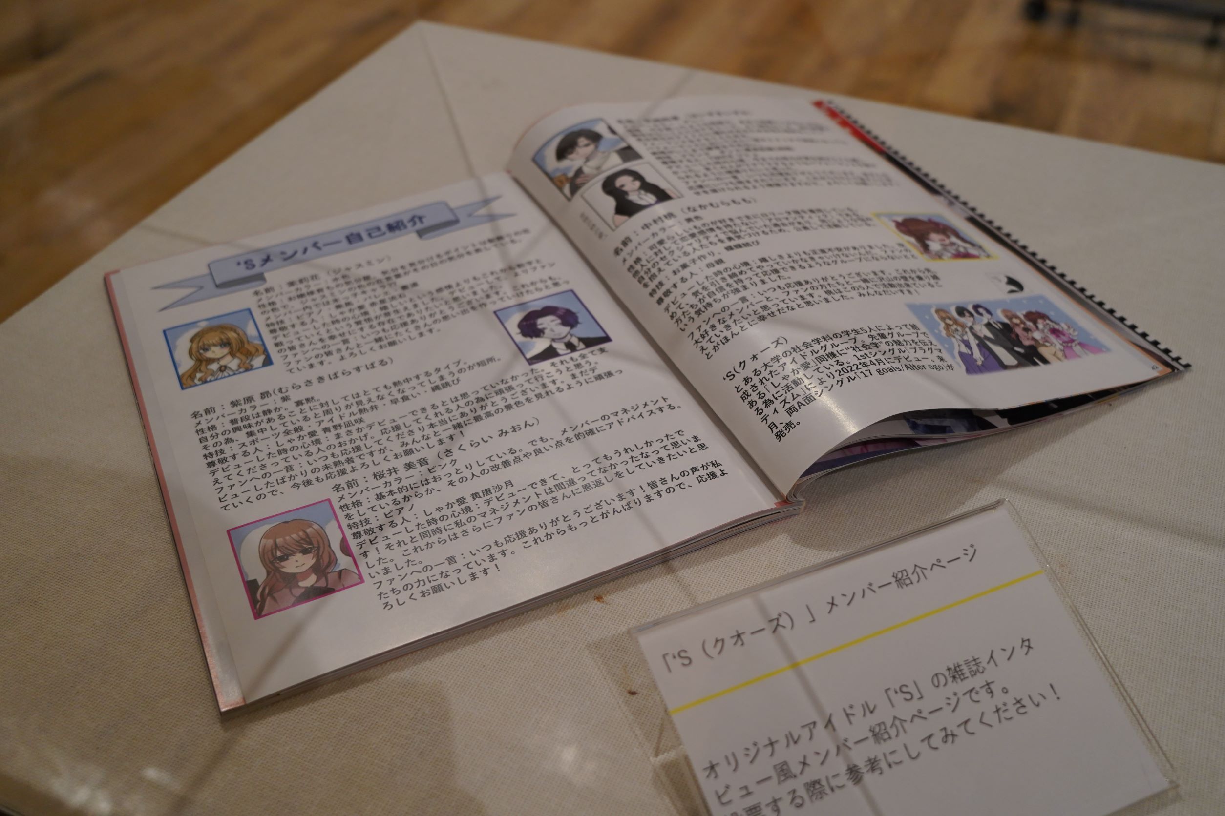 本展示会では、社会学科の2年生以上を対象とした科目「メディアコンテンツ実習(田島悠来 講師担当クラス)」の、まさにZ世代の受講生が中心となって、日本のメディア・エンターテインメントの歴史、特にはこうした現代にも続く「レトロなサブカル」が現れてくる1980年代以降の状況について、それぞれの関心に従って「ジャニーズのアイドル」「音楽」「アニメ」という三つの軸から雑誌メディアを素材にして紐解いていく研究・調査を実施し年表を作成、オリジナルの「アイドル」である「‘s(クォーズ)」を制作した成果を披露します。また、『明星』やプロマイドといった芸能関係の貴重な資料も現物展示しています。
