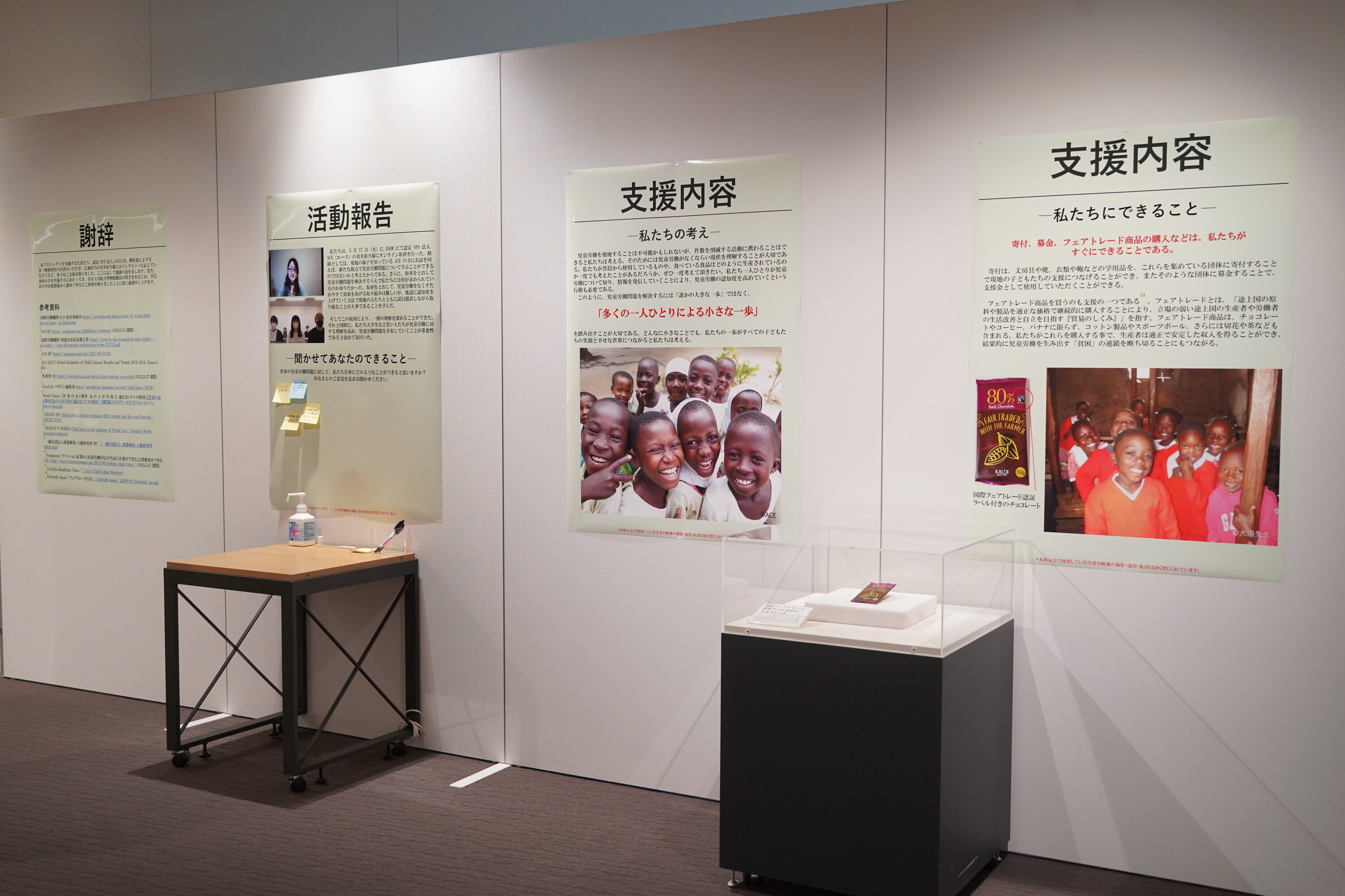 本ゼミ展は、ご来場くださった方々と、私たち一人ひとりがグローバル・シティズンとして今できることをともに考え行動に移そうとの思いから、参加型展示にしています。展示の最後に「聞かせてあなたのできること」と題した掲示用スペースを設けていますので、是非皆さまのご意見をお寄せいただけますと幸いです。