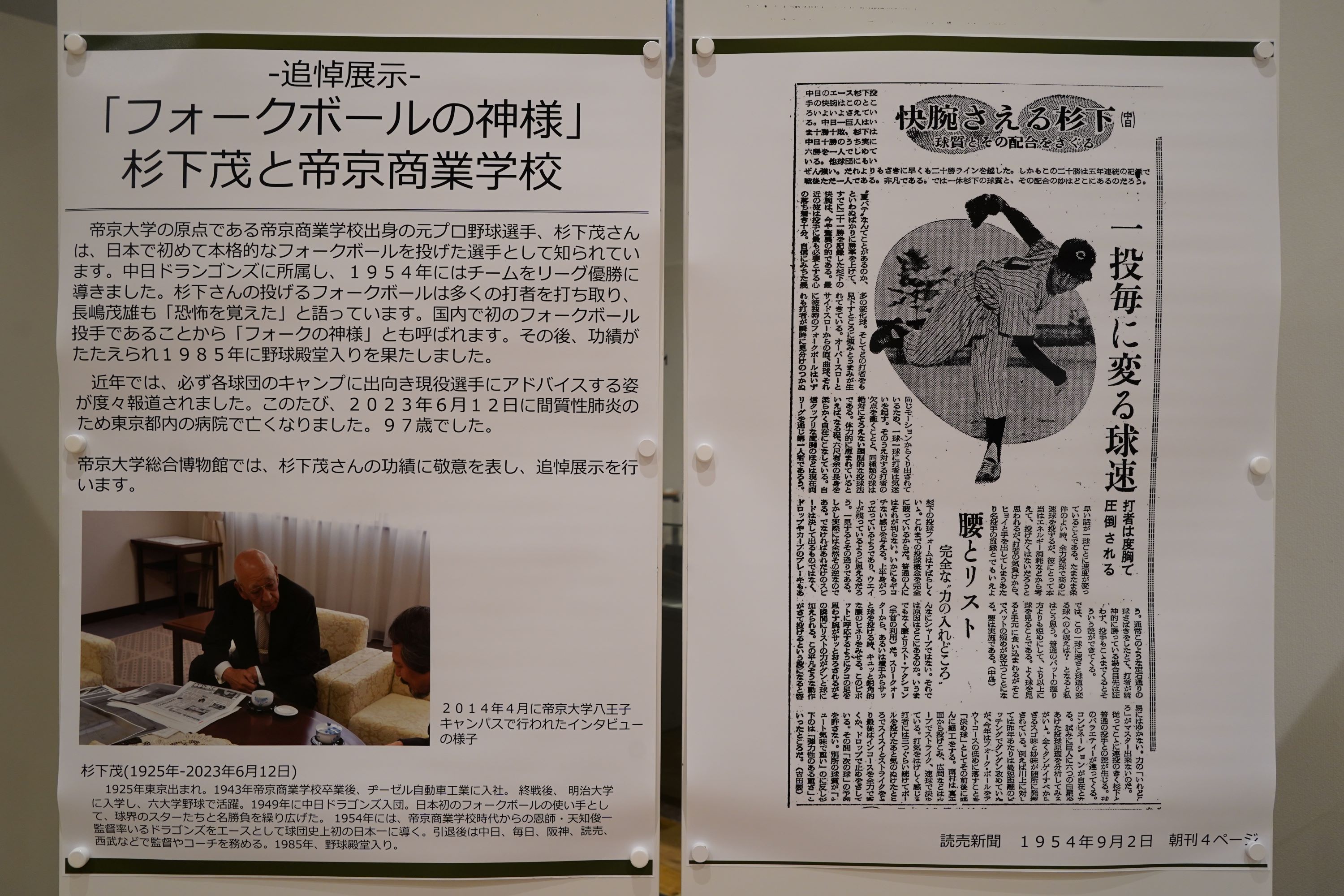 帝京草創期を知る卒業生のおひとりとして、当館の開館準備や学校史の調査・研究にご協力いただきました。本展覧会では、杉下茂さんの功績に敬意を表し、追悼展示を行います。