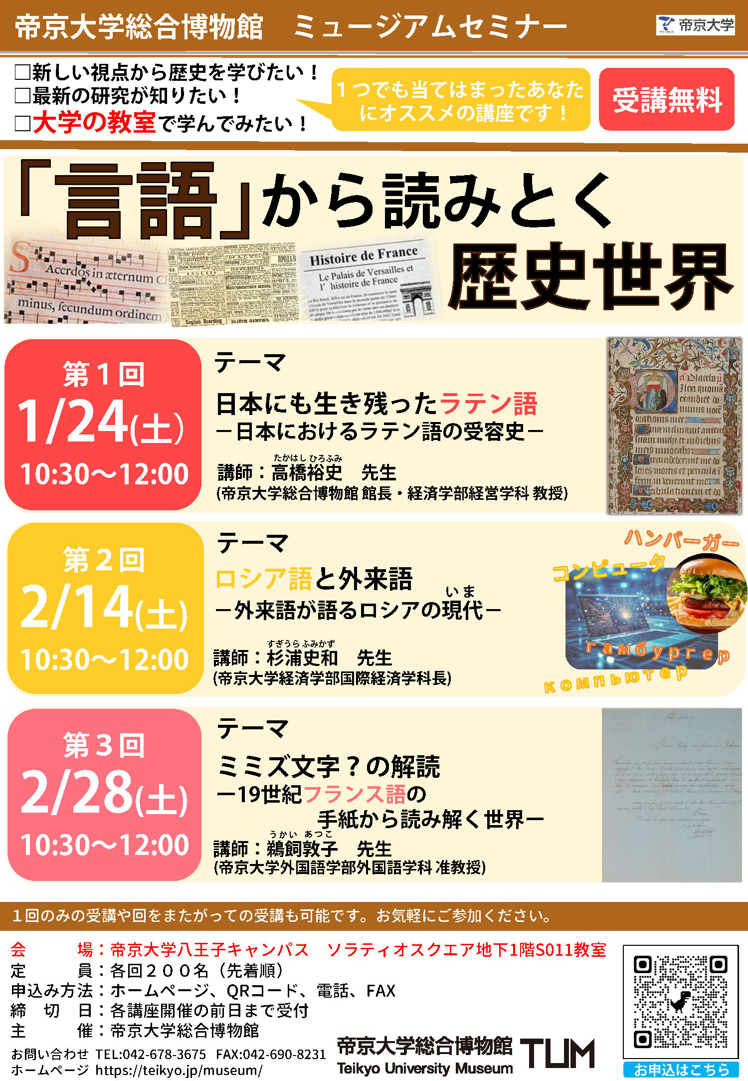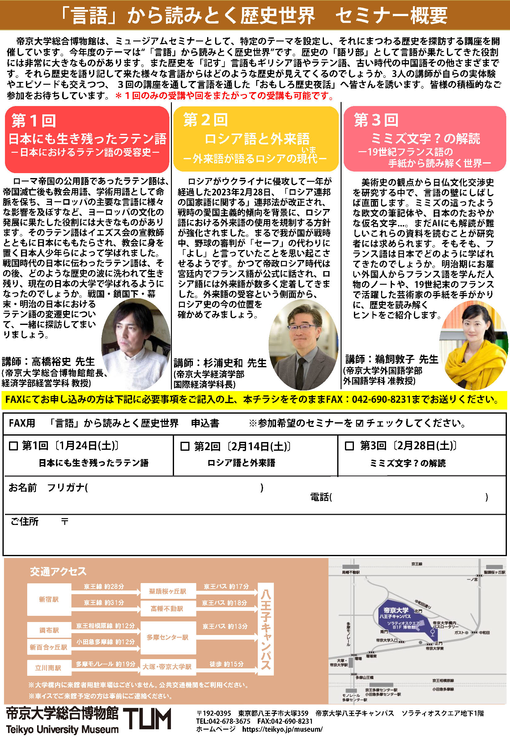 各講座のお申込は以下の申込フォームもしくは、帝京大学総合博物館までお電話(042-678-3675)もしくはFAX(042-690-8231)にてお申込下さい。