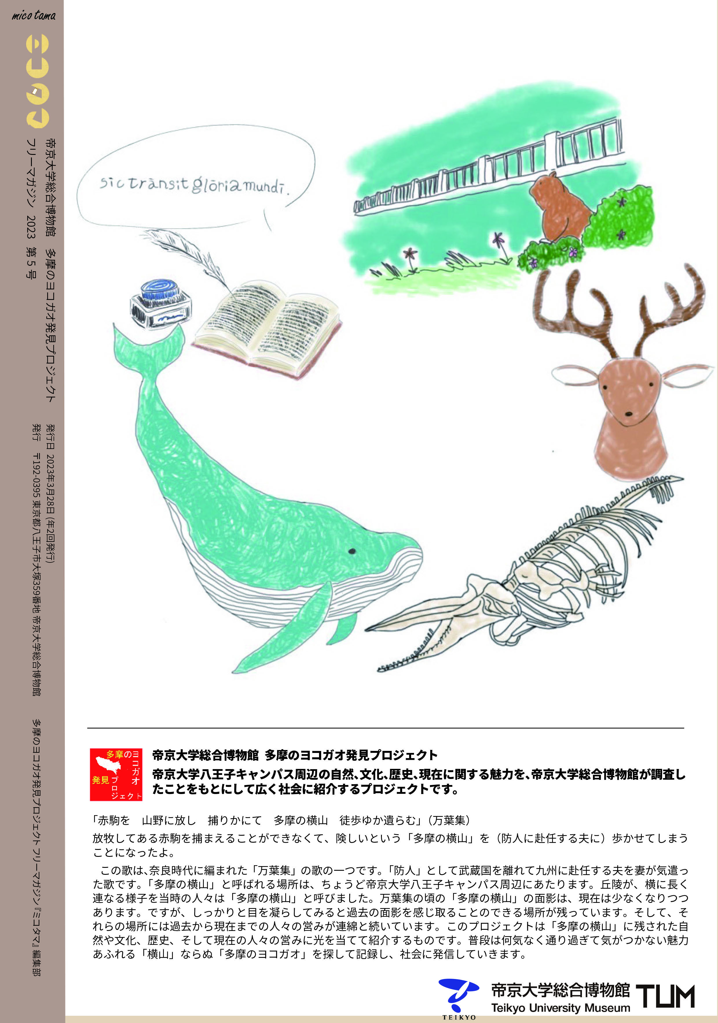 帝京大学総合博物館と本学学生が、多摩のヨコガオ発見プロジェクトの一環として、多摩の歴史・文化・自然・現在を記録し発信するフリーマガジン『ミコタマ』の第5号を刊行しました。本誌は、帝京大学総合博物館のバックアップのもと、本学学生が企画・取材・執筆・デザインを手がけたフリーマガジンです。