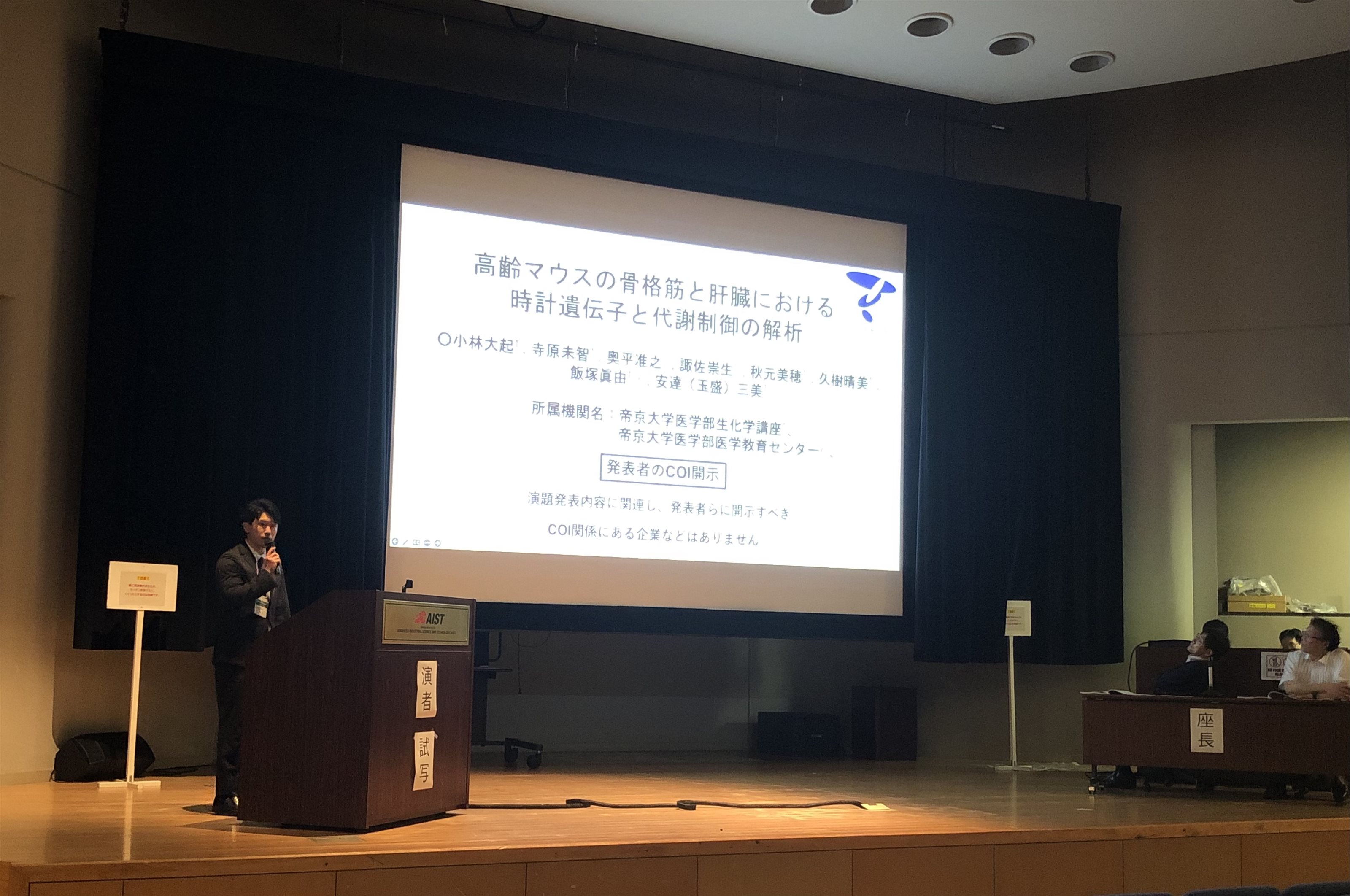 2025年6月14日、産業技術総合研究所つくばセンターにて開催された2025年度日本生化学会関東支部例会において、「高齢マウスの骨格筋と肝臓における時計遺伝子の代謝制御の解析」という演題でオーラル発表を行いました。自身にとって初めての学会発表であり、ポスターではなくメイン会場での口頭発表という貴重な機会をいただき、非常に緊張しましたが、同時に大変貴重な経験となりました。発表を通じて生化学研究の奥深さを改めて実感するとともに、他の先生・研究者の方々の発表の完成度の高さに強く刺激を受けました。今回の経験を糧に、残りの学生生活はもちろん、医師としての今後の歩みにおいても、臨床と研究の両立を心がけ、医学の進歩に貢献できるよう弛まぬ努力を重ねてまいります。