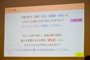 後半のグループワークでは、島教授のファシリテーションのもと、「10年先の新事業構想」をテーマにシナリオプランニングを実施しました。