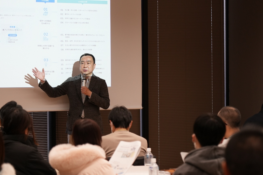 単一の主体が完結するのではなく、企業・行政・地域住民などが役割を分担しながら、長期的な視点で価値を共有していくことの重要性が示されました。 また、まちづくりにおけるビジネスモデルは固定的なものではなく、地域特性や社会状況の変化に応じて更新され続ける必要があることも指摘されました。本講義は、技術環境の変化を地域実装の視点から捉え、実践につなげるための示唆に富んだ内容となりました。
