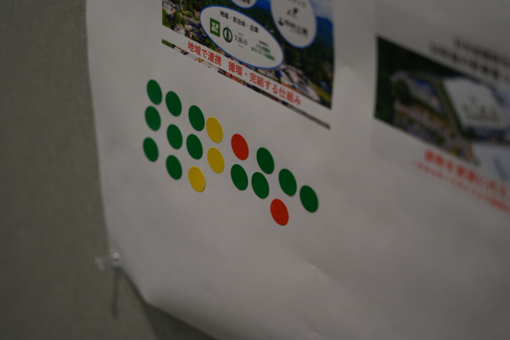 発表後はポスターセッションが行われ、参加者は各チームのポスターを巡りながら議論を深めました。投票は一人3枚の丸シール方式で実施され、関心や共感が可視化されました。