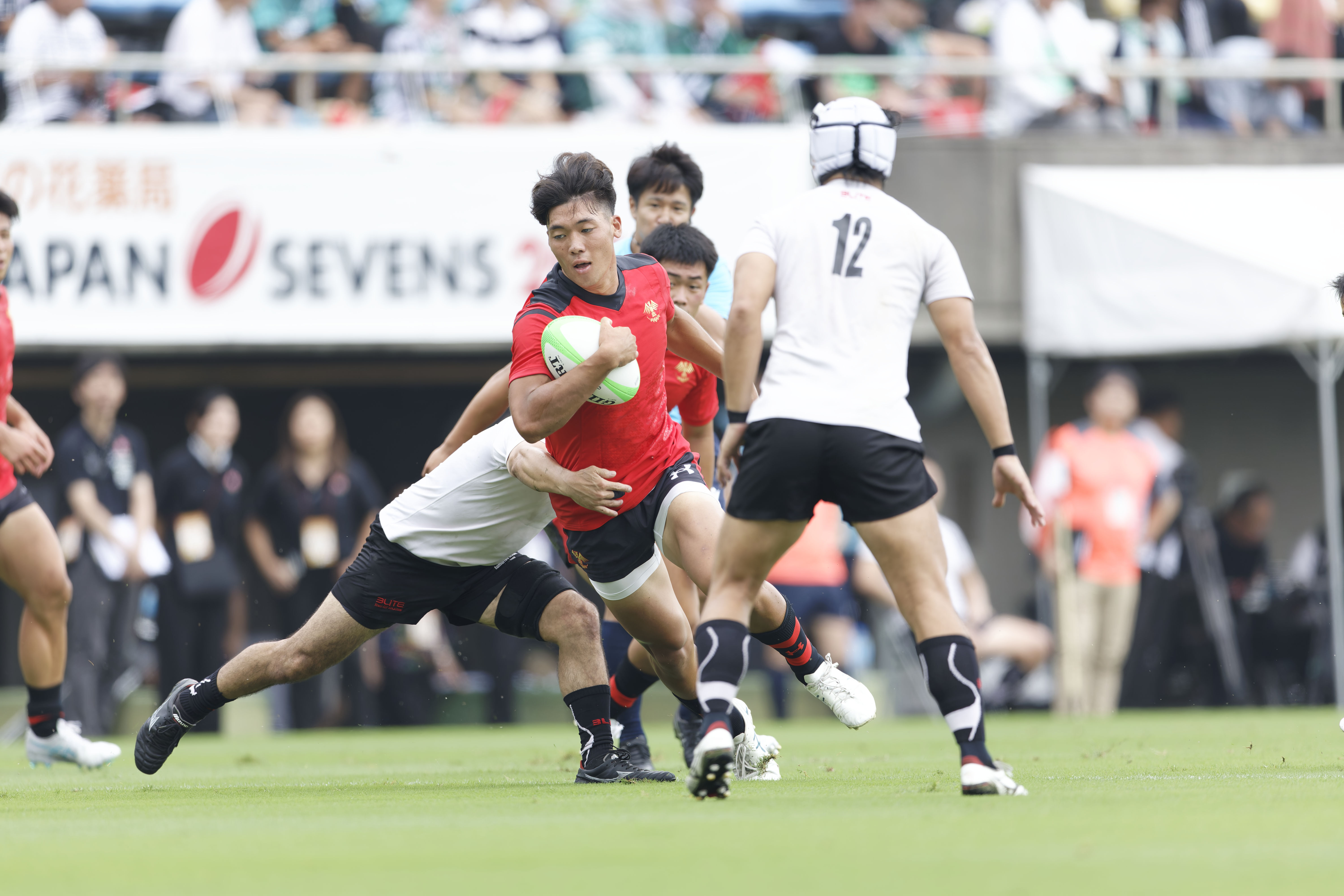 後半は帝京が総じてゲームを支配。ペナルティをもらい、タップキックからの攻撃で山田、榎宮がトライを奪い、最初の3分で大きく突き放す(33-10)。その後、ミスからつながれて失点するも、終了間際、寺山のステップからのオフロードパスが神田につながり、神田が走り切ってトライ。40-17で帝京が勝利し、ジャパンセブンズ2024を5位という成績で終えた。