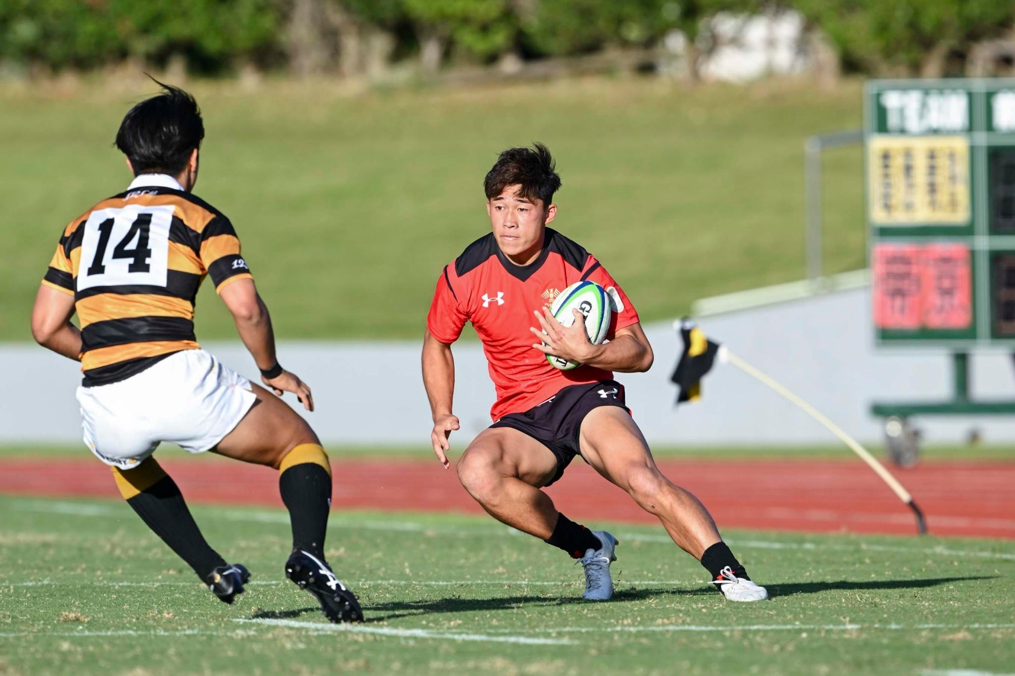 18分にはペナルティから、SO大町がクイックリスタート。相手の厳しいディフェンスにも耐えながら、つないで前進。ラックから、SH李-SO大町とつなぎ、大町が相手をはじきながら前進しトライ(12-0)。