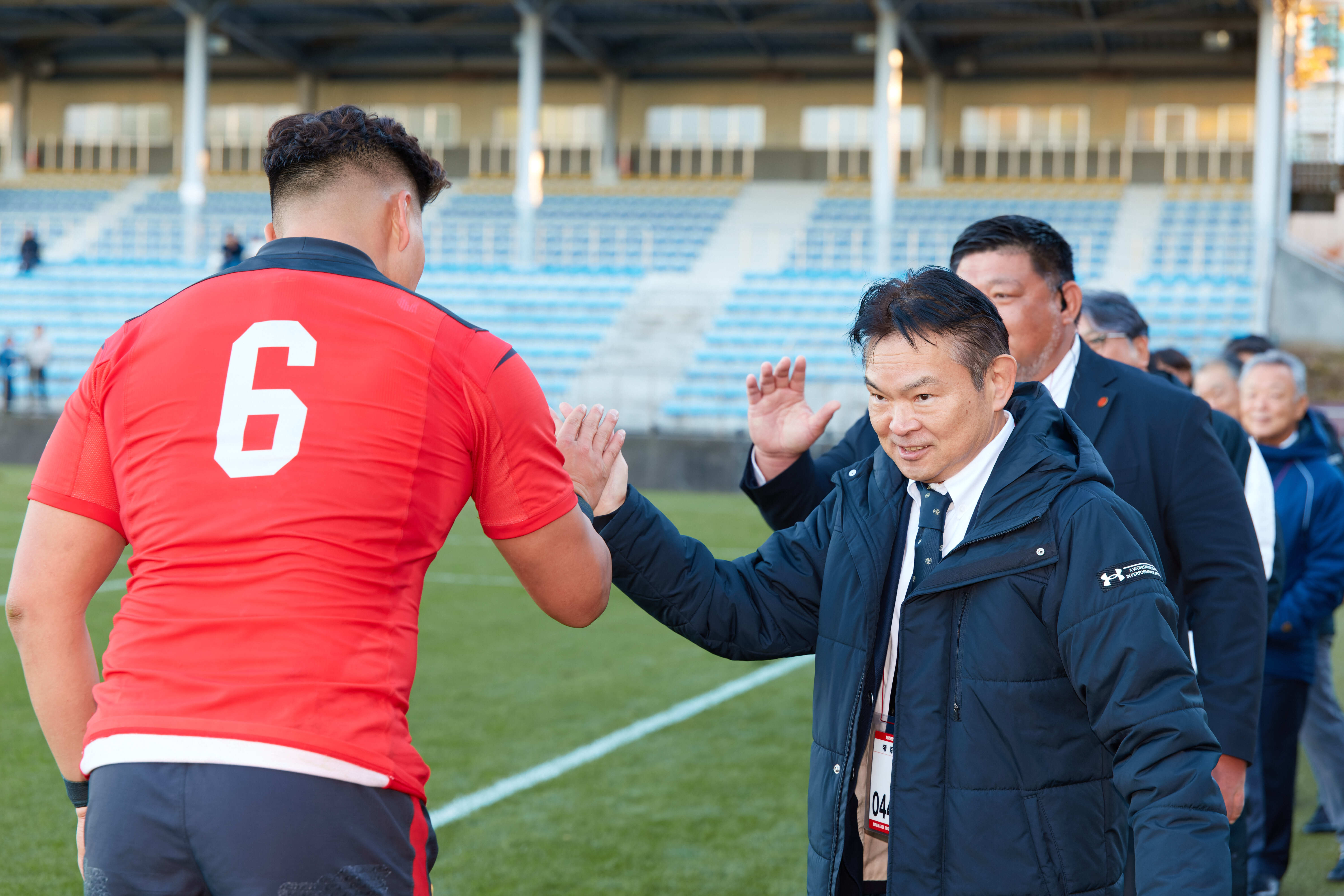 その後、WTB日隈のハイパントキャッチからチャンスを作るが、相手の厳しいタックルを浴び、一転ピンチとなる。相手ボールのラインアウトを奪ってつなぐが、ここでもプレシャーを受ける。FL森元が自陣インゴールでタックルを受けながらも落ち着いて処理し、グラウンディングせずにつないで、タッチに逃れる。