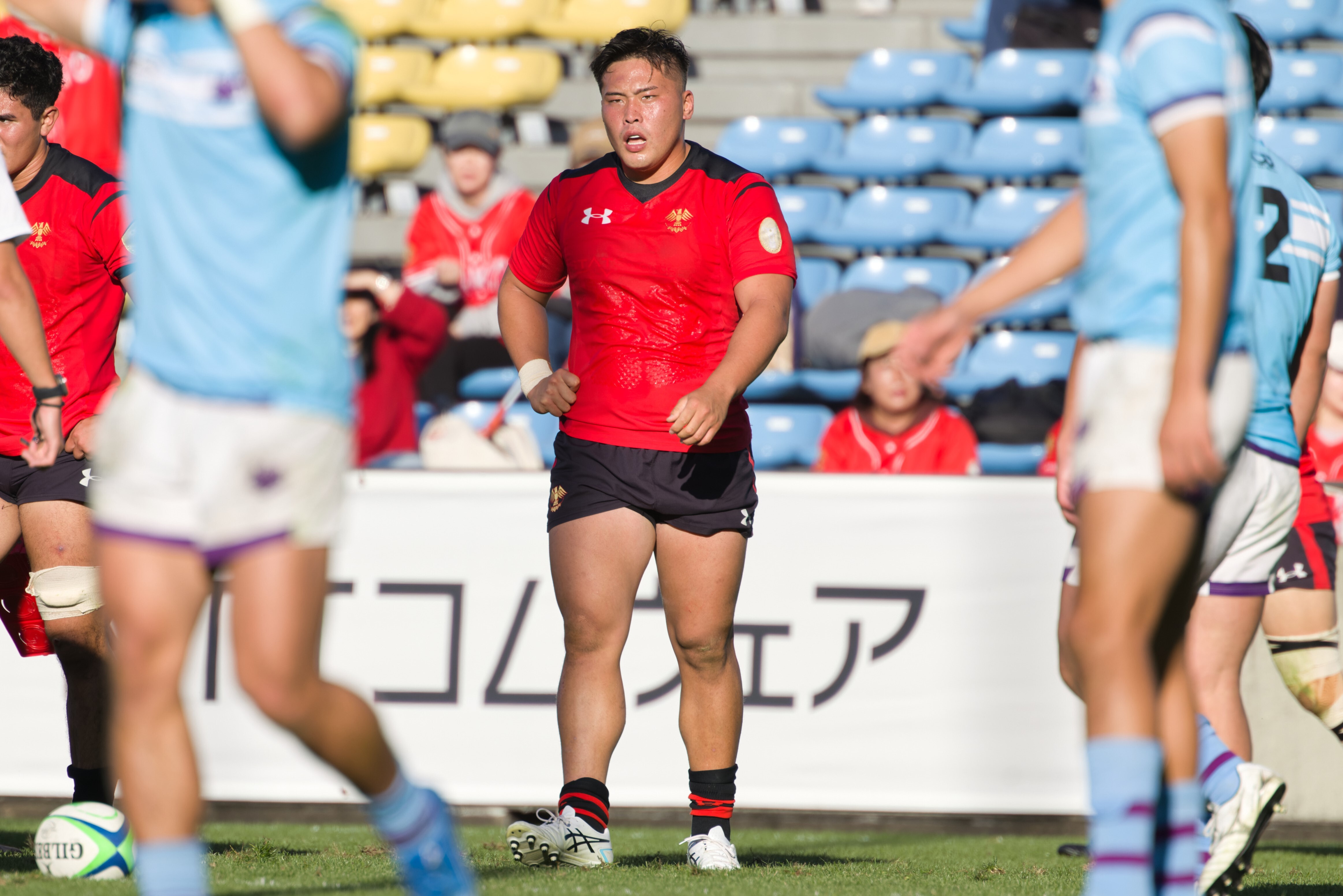 自身のプレーとしては、フィールドプレーでは何度かボールキャリーで前に出ることができましたが、スクラムで何度かペナルティを取られてしまったので、そこは試合中の一つの反省点ですし、大学選手権に向けて修正していかなければいけないと思っています。