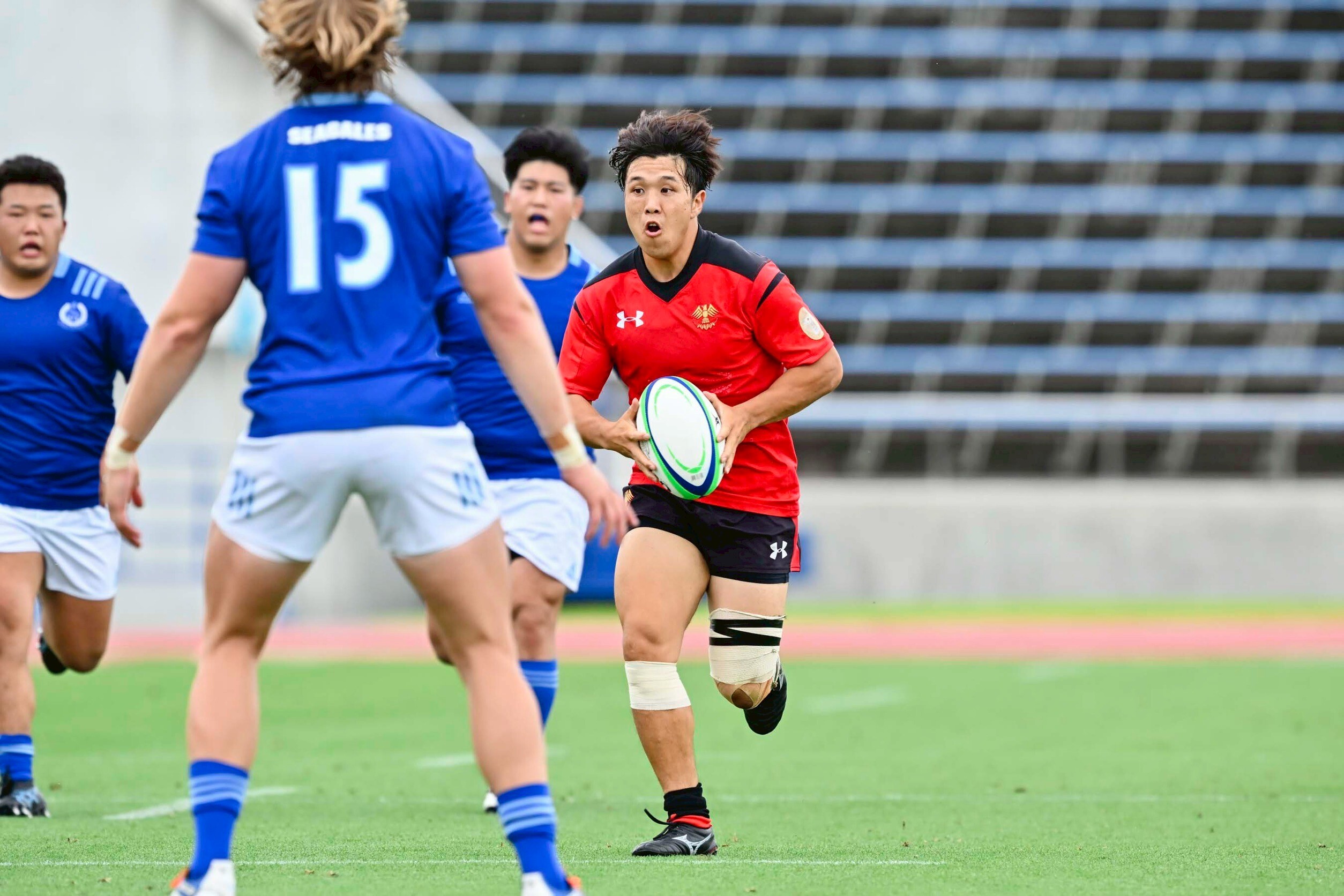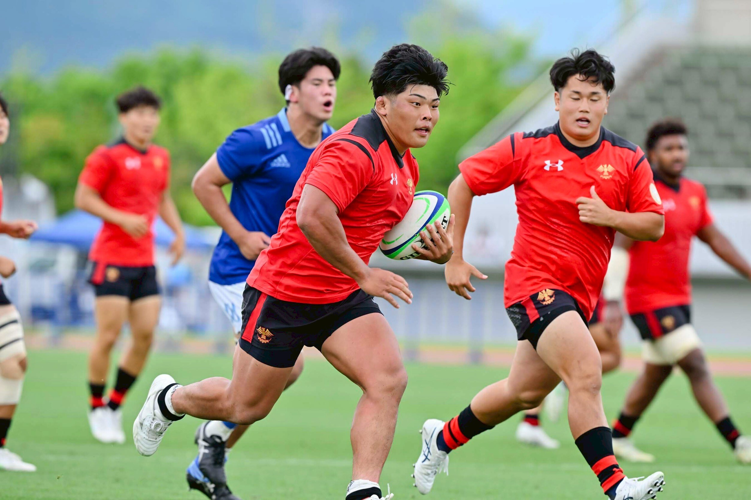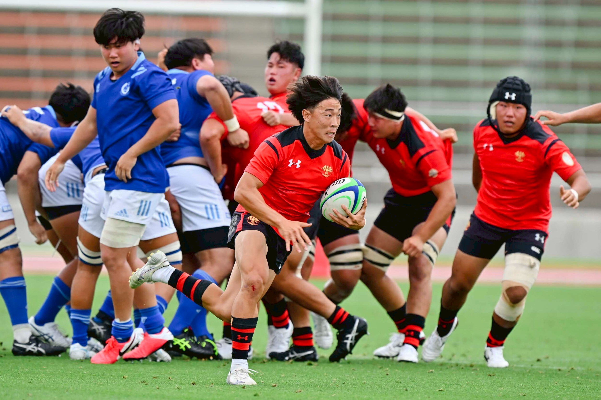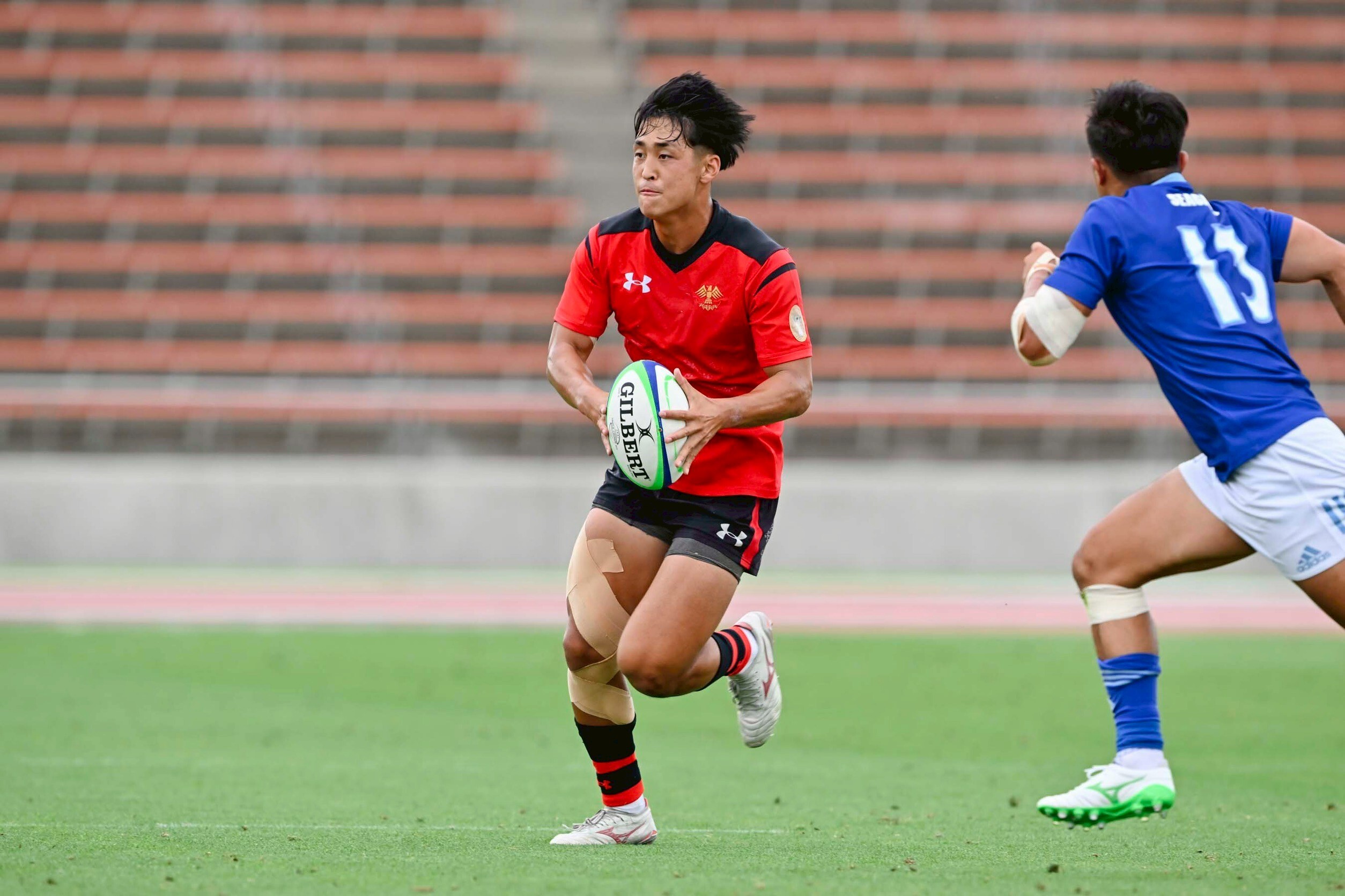 29分、スクラムから、SH三田村が仕掛けて前進。SO高本にパスし、高本が抜け出してトライ(85-0)。32分、ラインアウトからモールを形成。HO梶川が持ち出し、WTB吉田(有佑)にパス。吉田が抜け出し、SH三田村にパス。三田村が走り切ってトライ(90-0)。