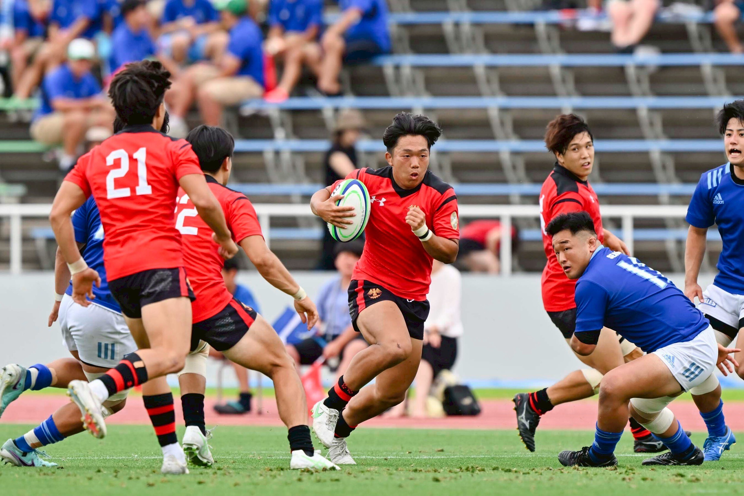 40分には、相手のノータッチキックをWTB吉田(有佑)がキャッチし、FB吉田(琉)にパス。吉田(琉)が仕掛けて前進。さらにつないで、ラックからSH武智-SO本橋-CTB上田(倭士)と渡り、上田が抜け出し、走り切ってトライ。