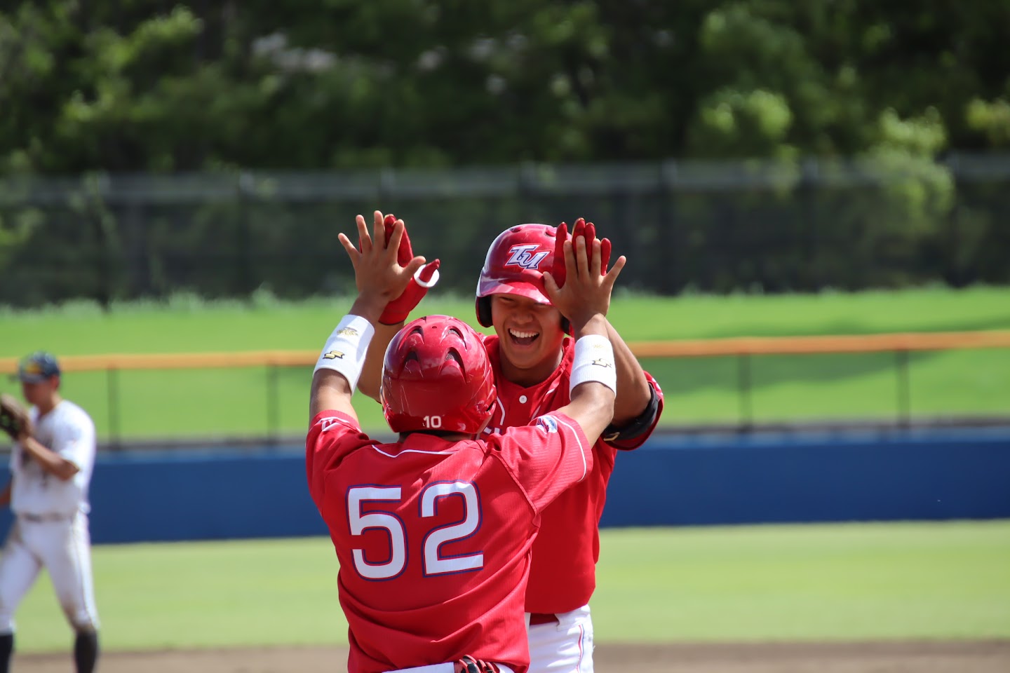 初回に山田(3年:滋賀学園)のタイムリーで先制。2回に逆転を許すも、3回以降、沖田(1年:岡山学芸館)、近藤(1年:大宮東)、久野(4年:岡山学芸館)が粘りの投球で無失点に抑え、。8回に金澤(3年:日大三)、森田(2年:履正社)のタイムリーなどで逆転に成功。9回は森剣之助(2年:創志学園)のファインプレーなどもあり、勝利を掴み取り、今季初となる勝ち点を獲得した。