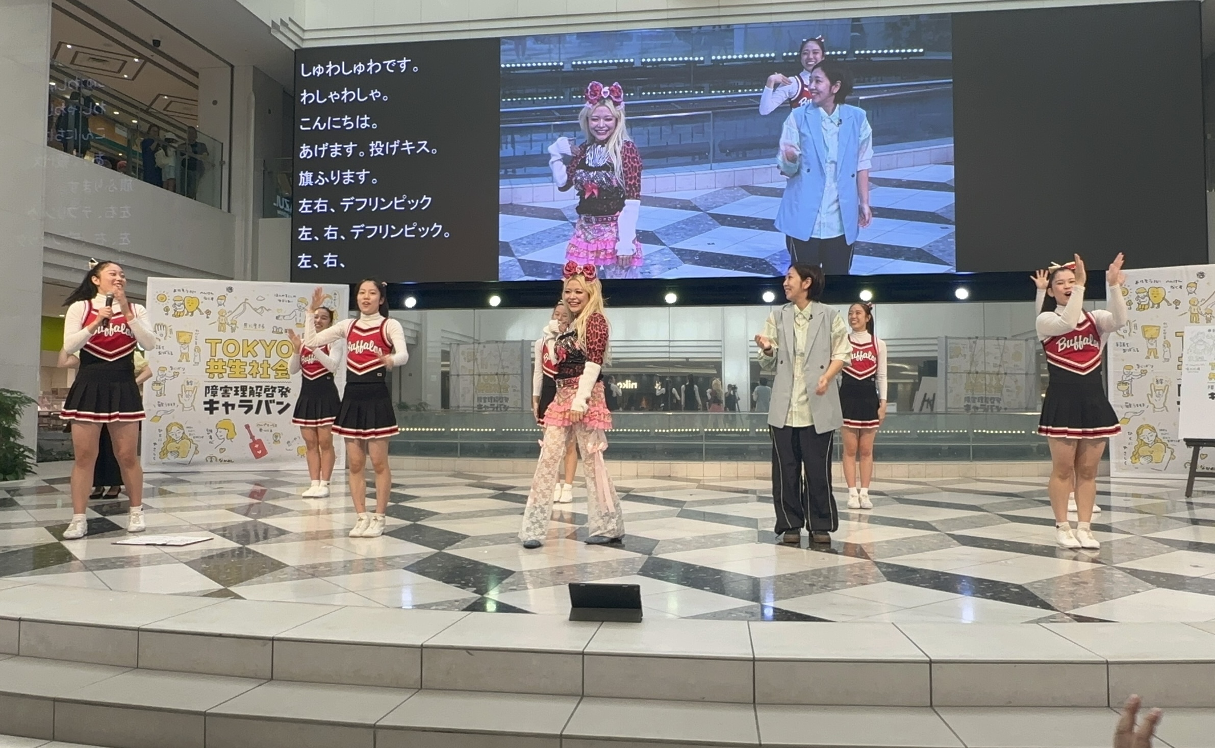 本イベントは2025年11月15日(土)~26日(水)に日本で初めて開催される「東京2025デフリンピック」の開催を契機として障がい者に対する理解促進を図り、共生社会の実現をめざすものです。本学チアリーディング部は東京都より要請を受け出演し、当日はお笑い芸人のエルフのお二人とともに「しゅわしゅわ☆デフリンピック!」※を会場に訪れた方々と一緒に踊り、障がい理解を深めると同時に盛り上げを見せました。