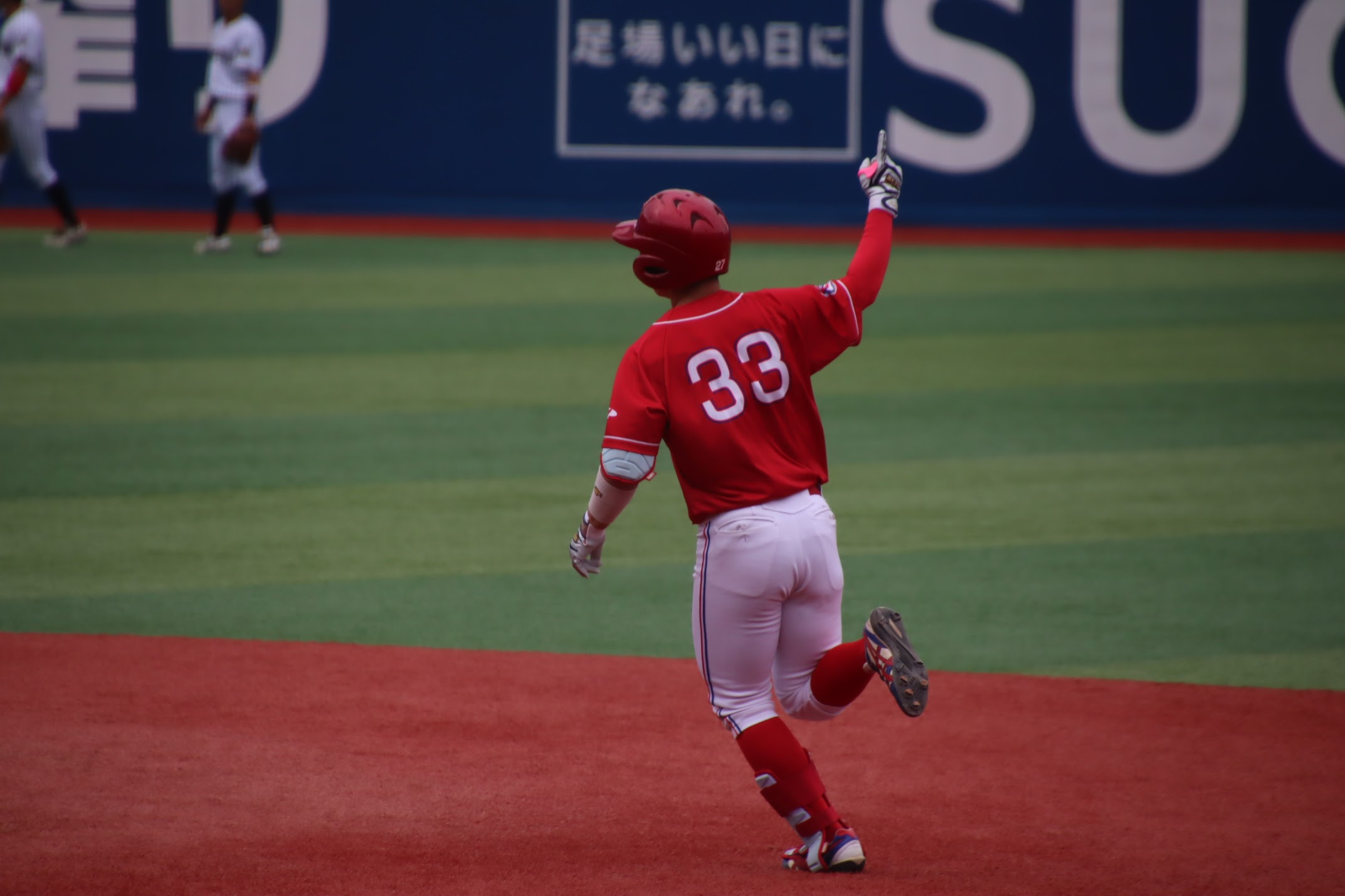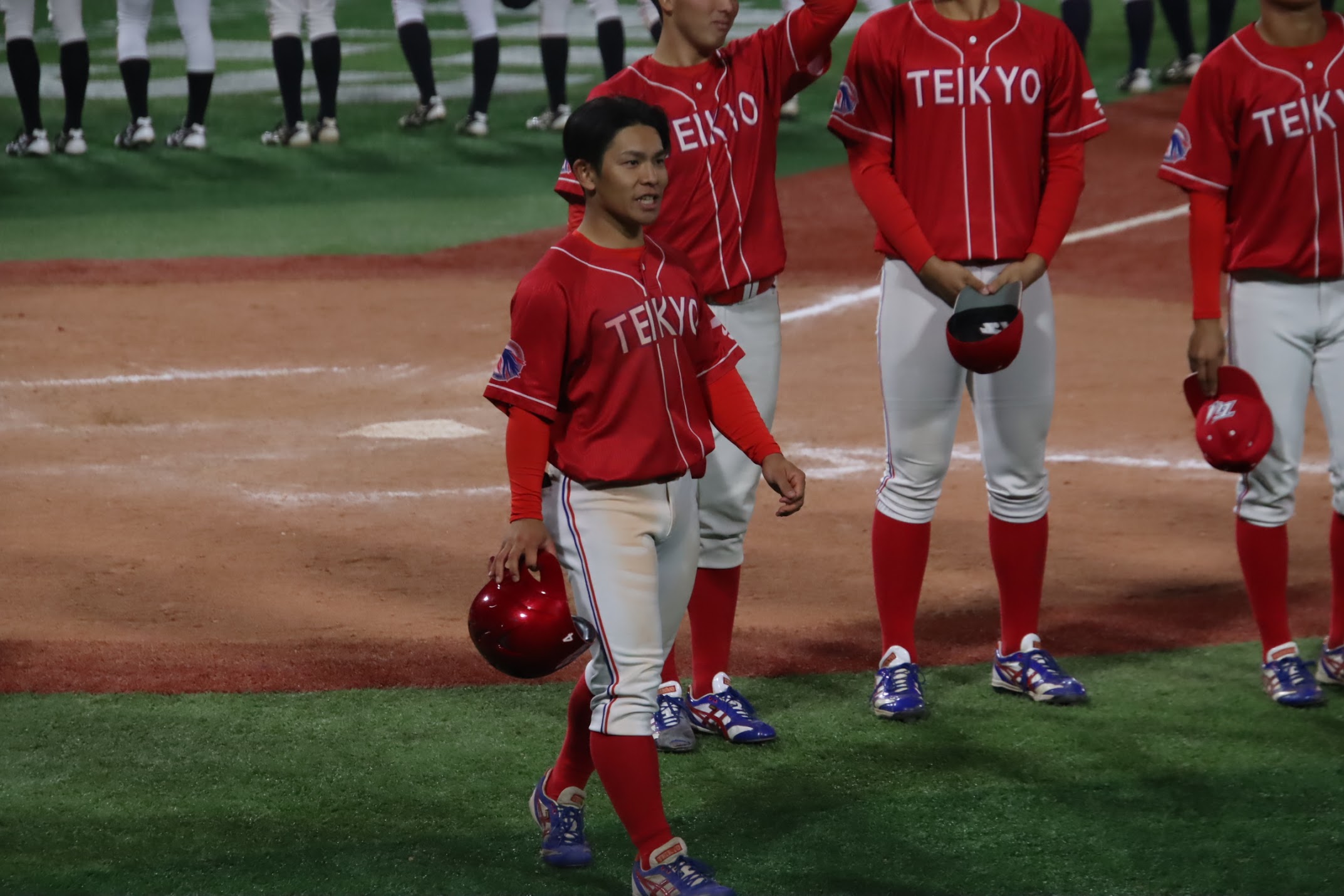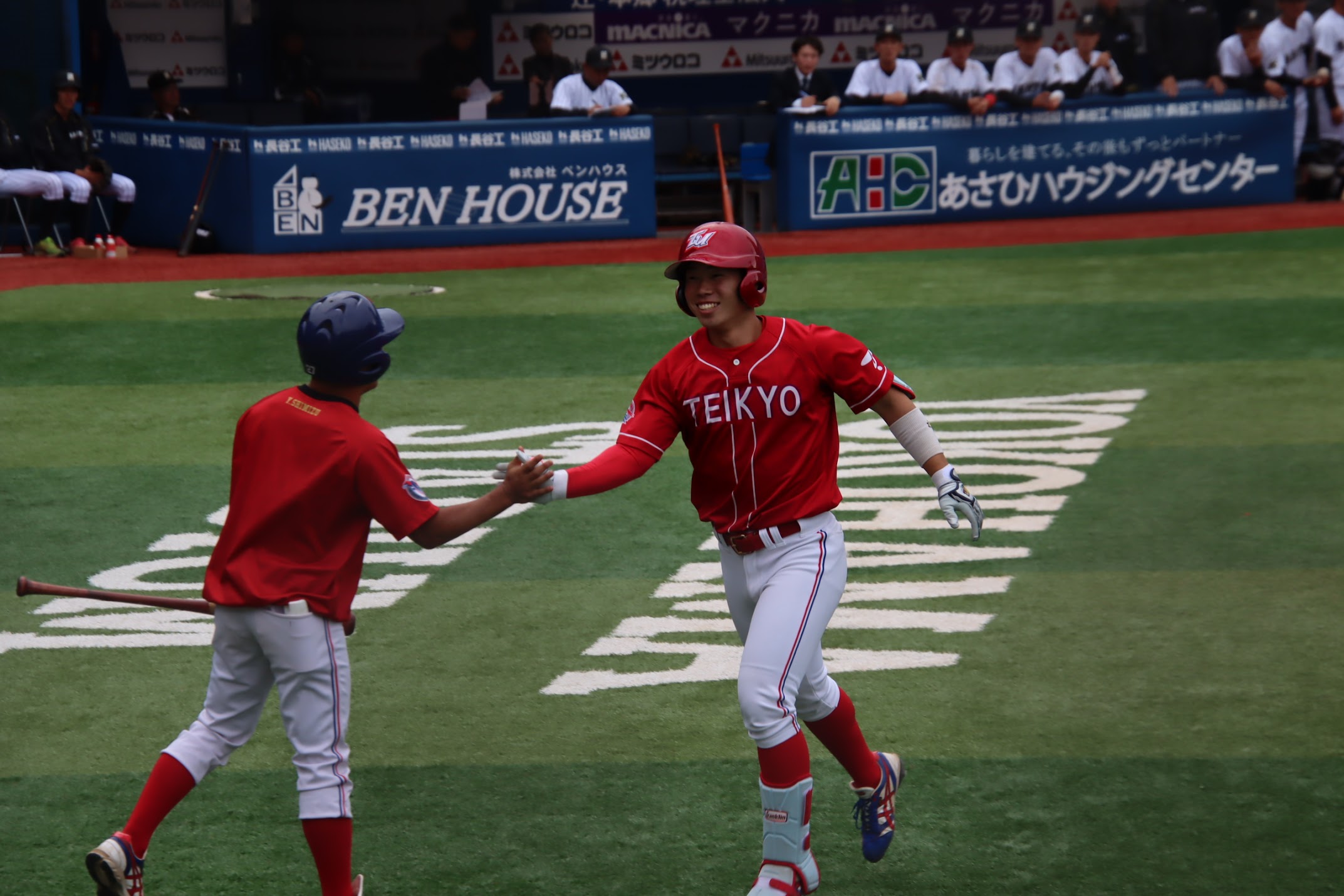 初回、先発の宮田(4年:和歌山商業)が自身のエラーなども絡み、4失点し降板する。代わった伊藤(3年:八王子北)が4回まで無失点に抑える好リリーフをする。打線は、2回に牧原(1年:日本大学藤沢)、5回に彦坂(4年:享栄)のホームランで同点に追いつく。その裏に勝ち越しを許すも、6回に宮城(4年:山口県桜ケ丘)のタイムリーですぐさま同点に追いつく。5回以降、蓮(2年:帝京第三)、近藤(1年:大宮東)、久野(4年:岡山学芸館)と無失点リレーを続ける。9回に池田(4年:宇部鴻城)の走者一掃のタイムリーで勝ち越しに成功する。その裏を3人で抑え、創部史上初となる関東地区大学野球選手権大会での勝利を掴んだ。