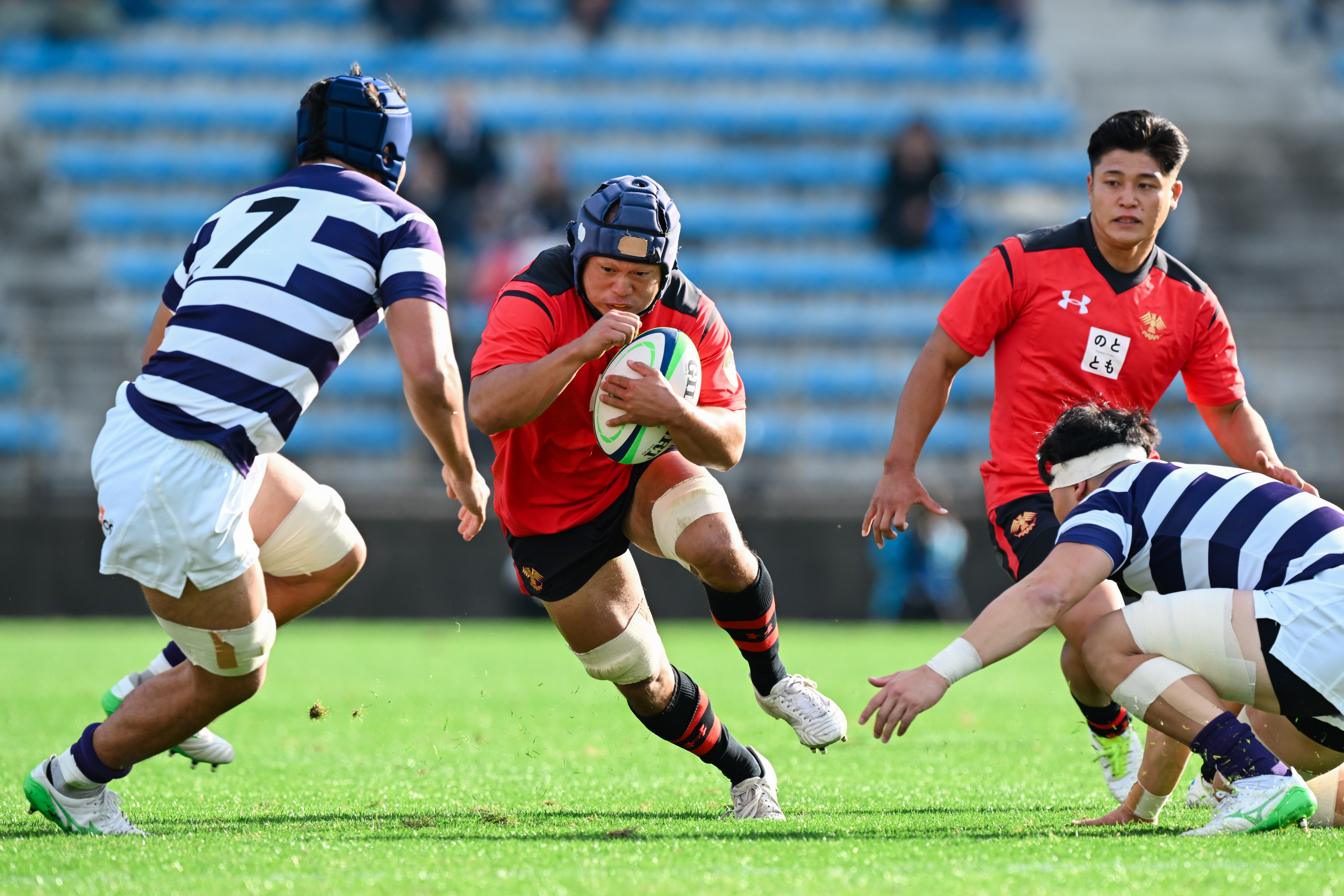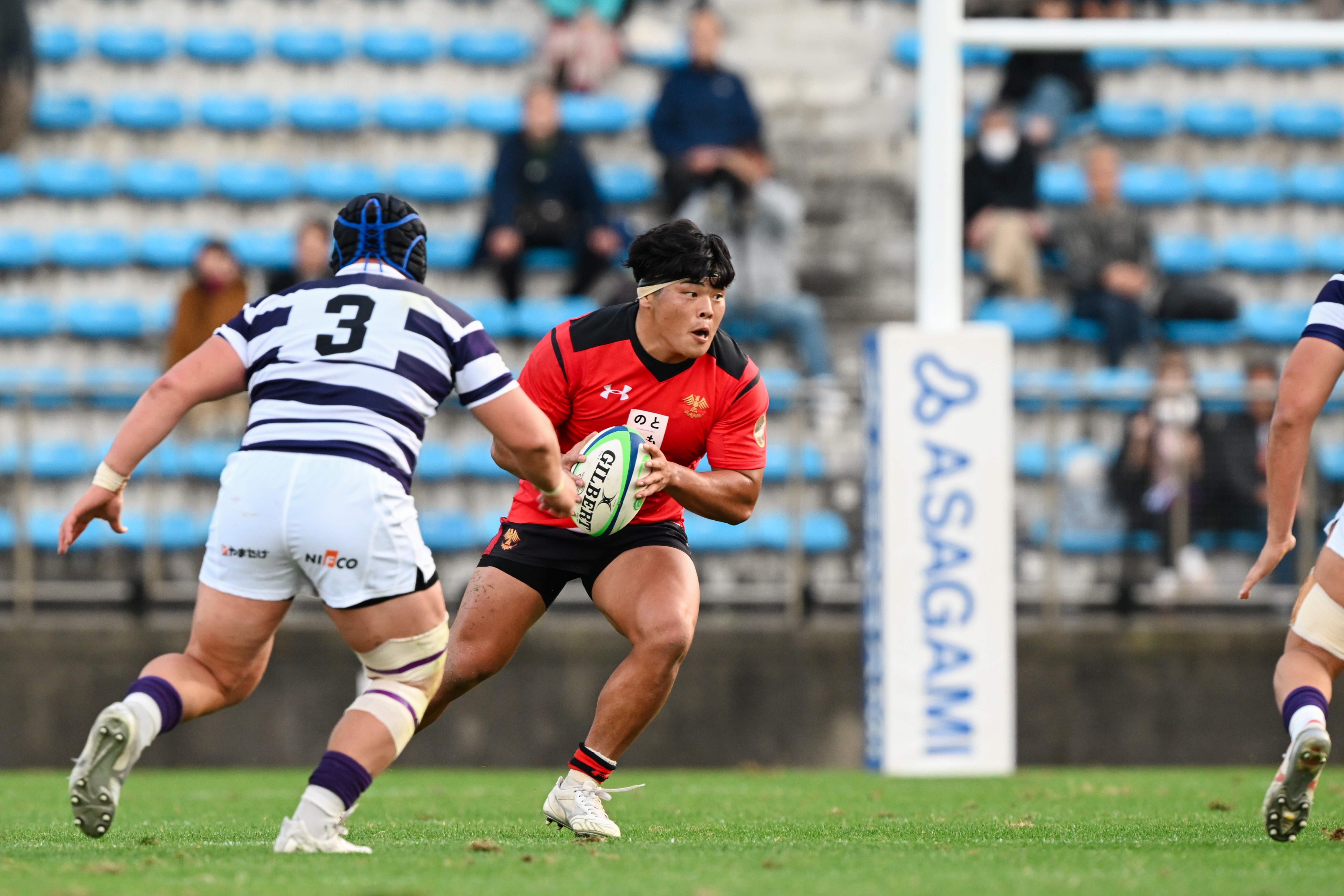 両者がっぷり四つの展開から得点が動いたのは21分。帝京が攻め込み、相手の反則が重なる。ボールを地面に置いてのタップキックから、No.8ダウナカマカマが前進。ラックから、SH武智-HO髙矢と渡り、一度止められるも再度前進して髙矢がトライ(7-0)。