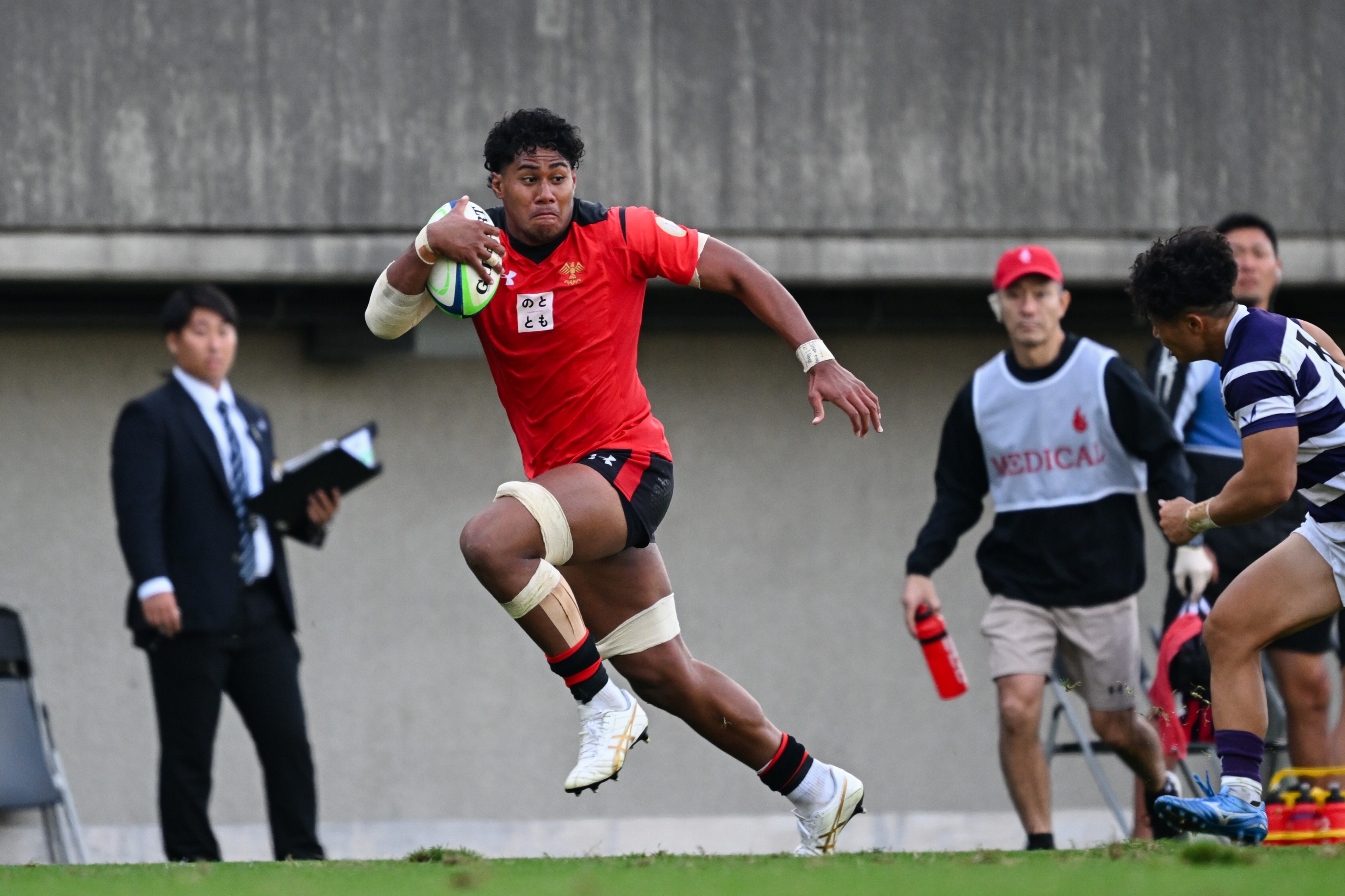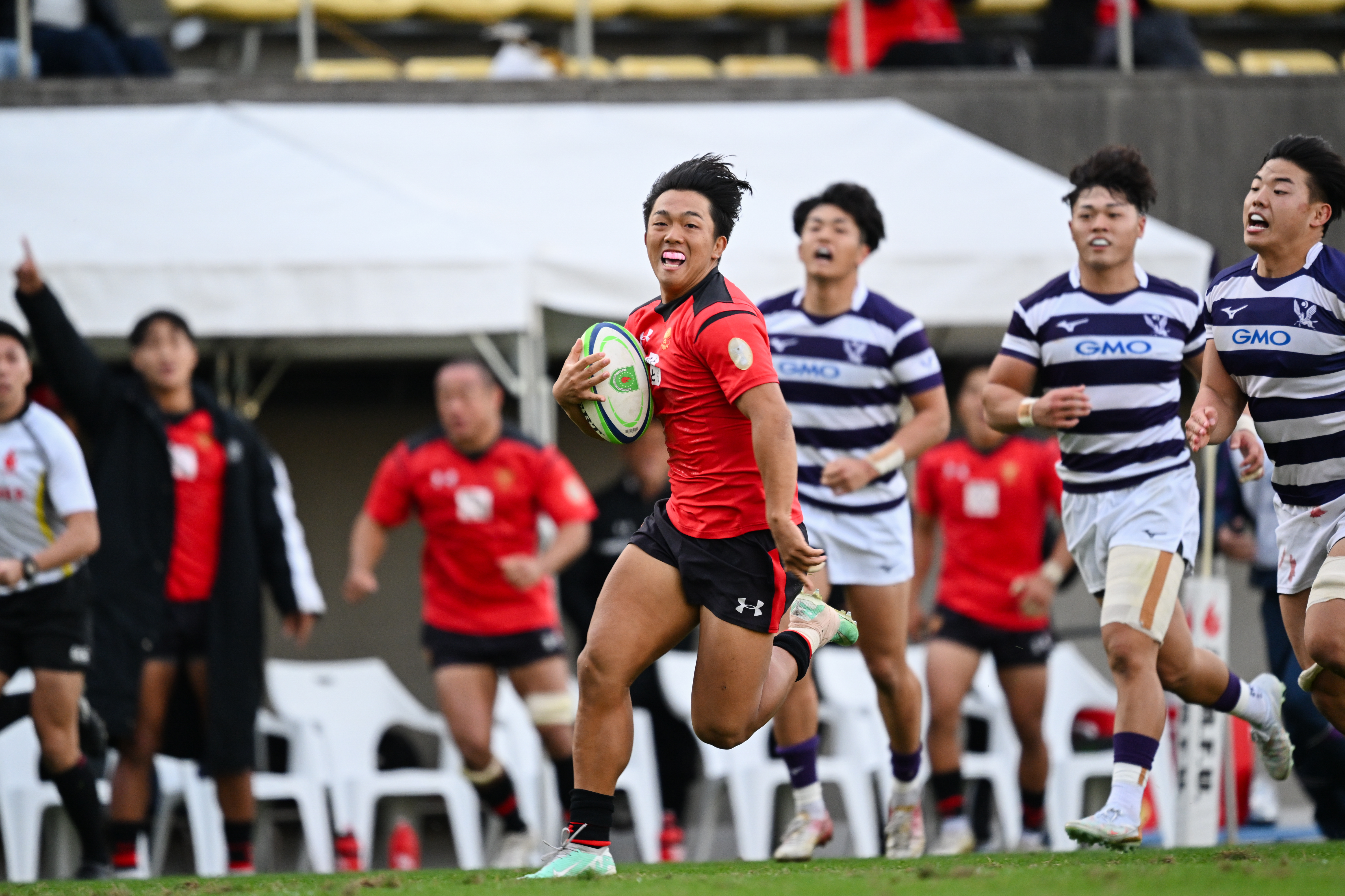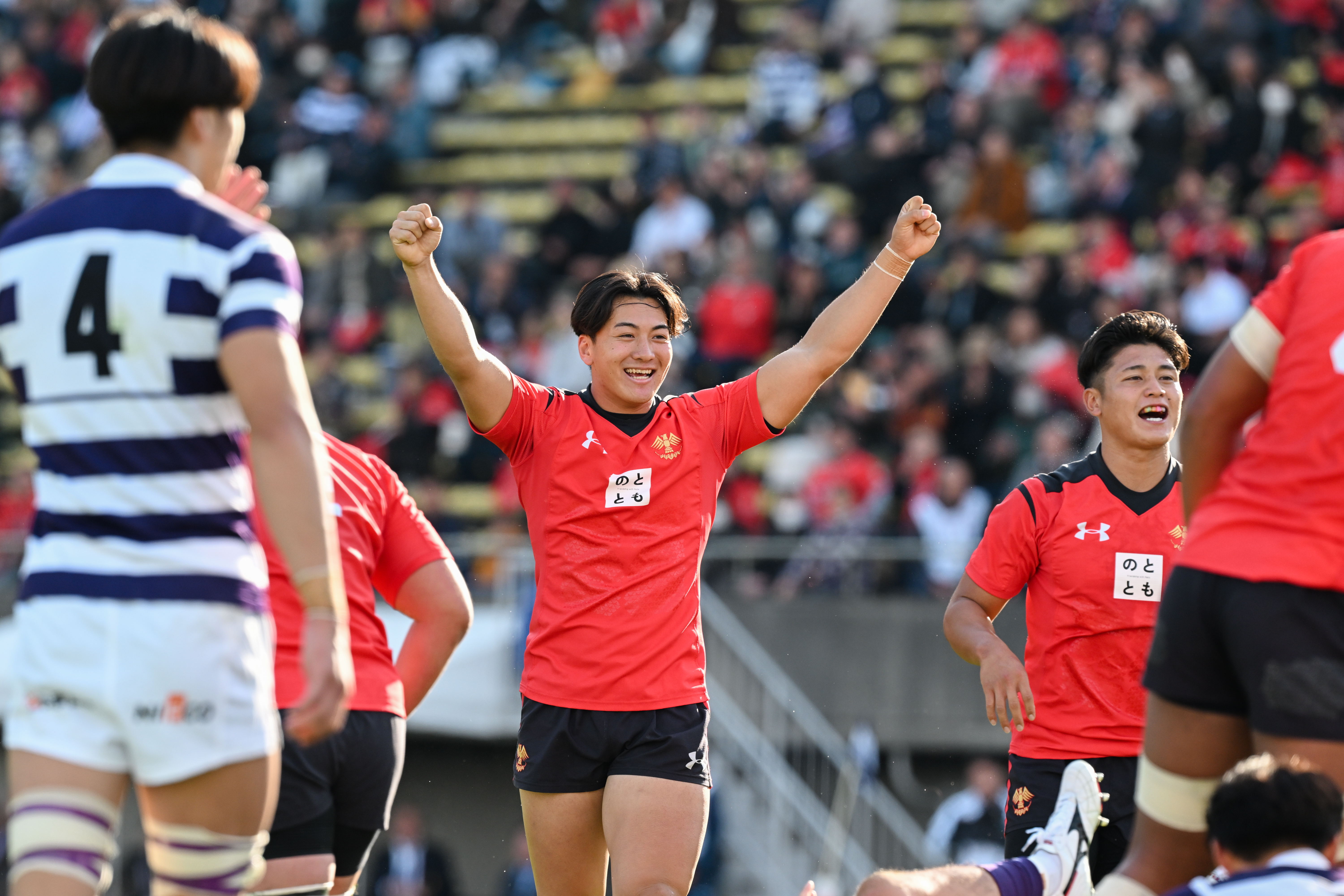 さらに激しい攻防が続く。40分、ラインアウトからフェーズを重ねる。ラックから、SH武智-SO本橋-CTB大町-WTB青栁-FLフィシプナと渡り、フィシプナが前進。さらに、青栁-FB吉田(琉)とパスし、吉田が抜け出してトライ(17-14)。ここで帝京が逆転した。