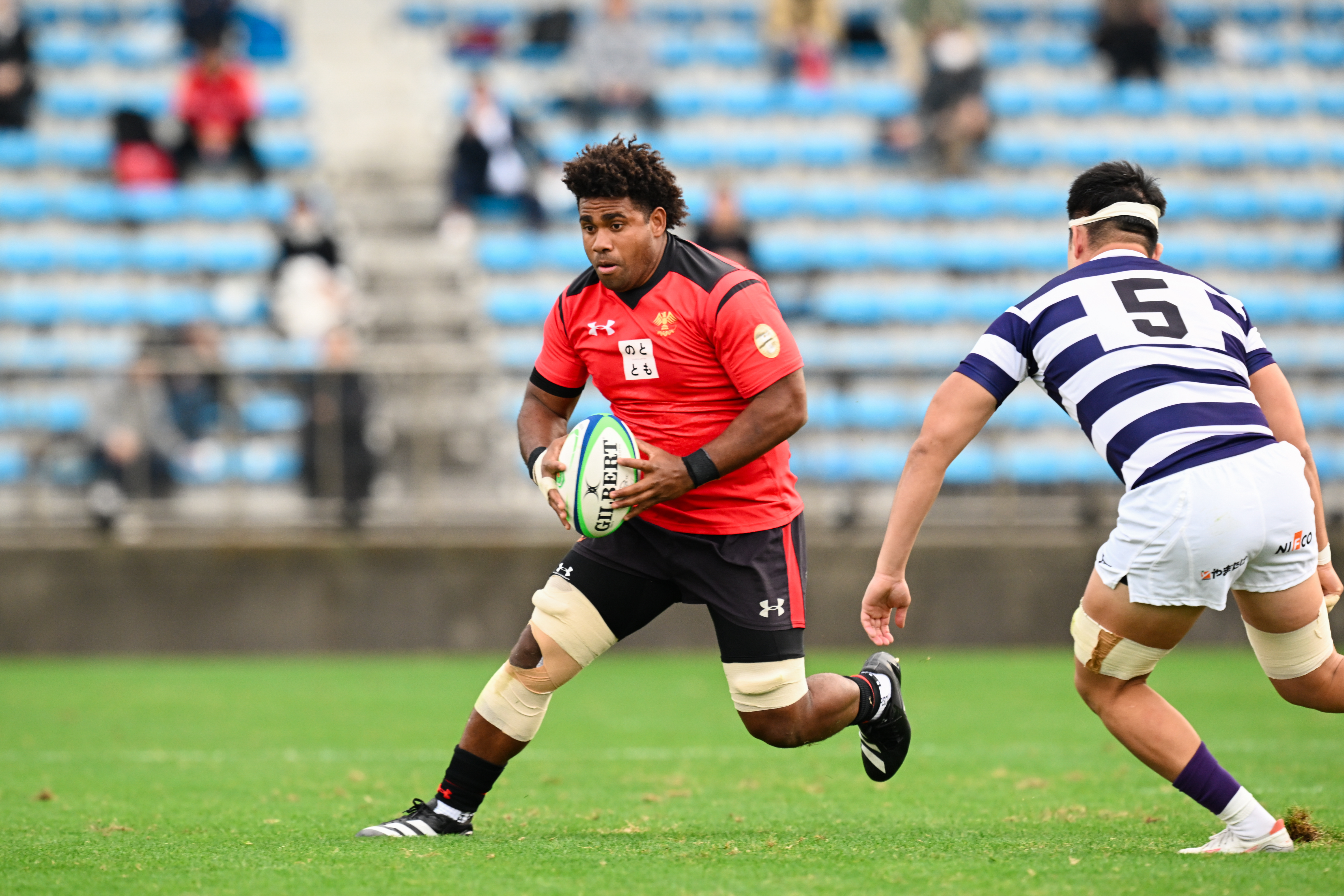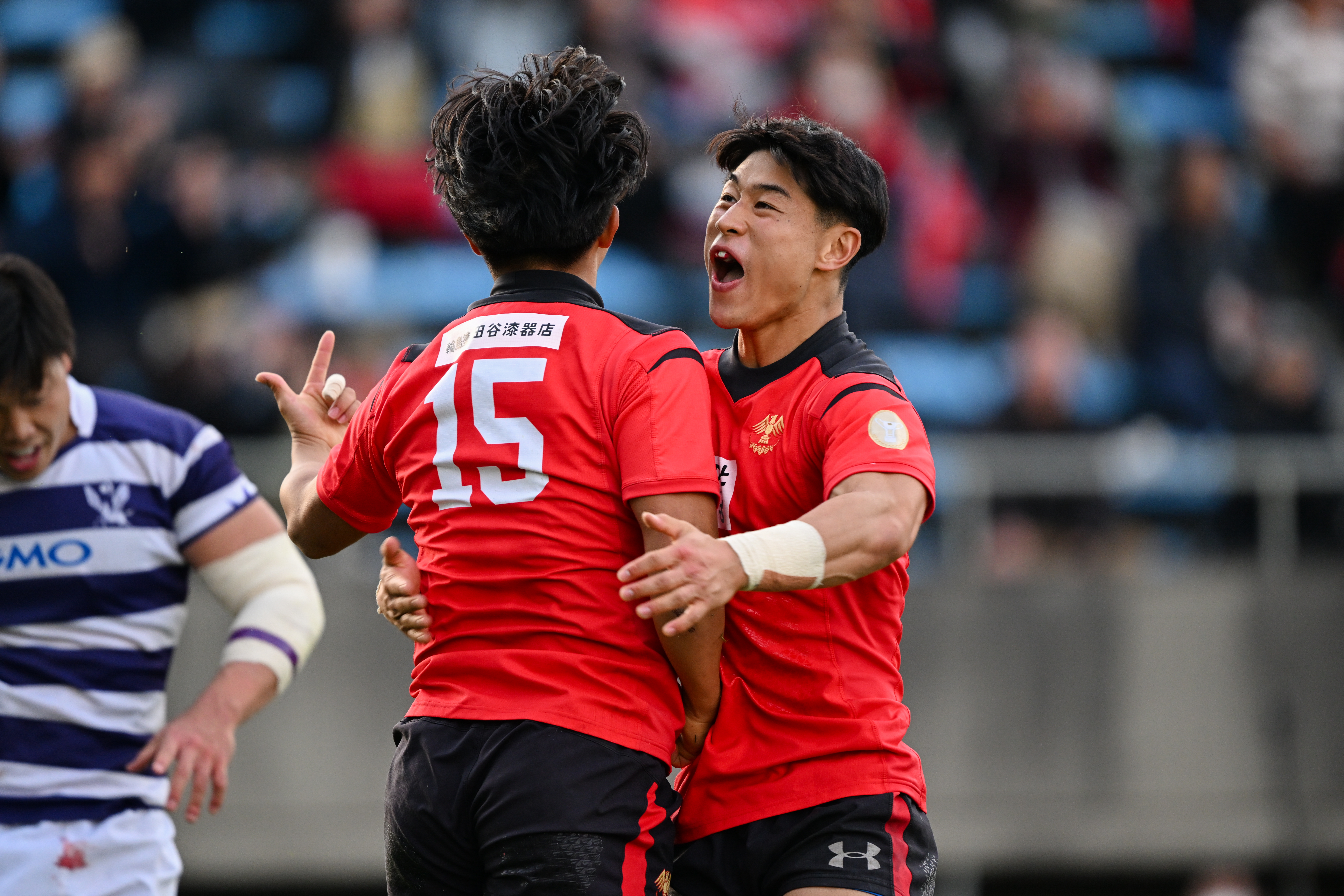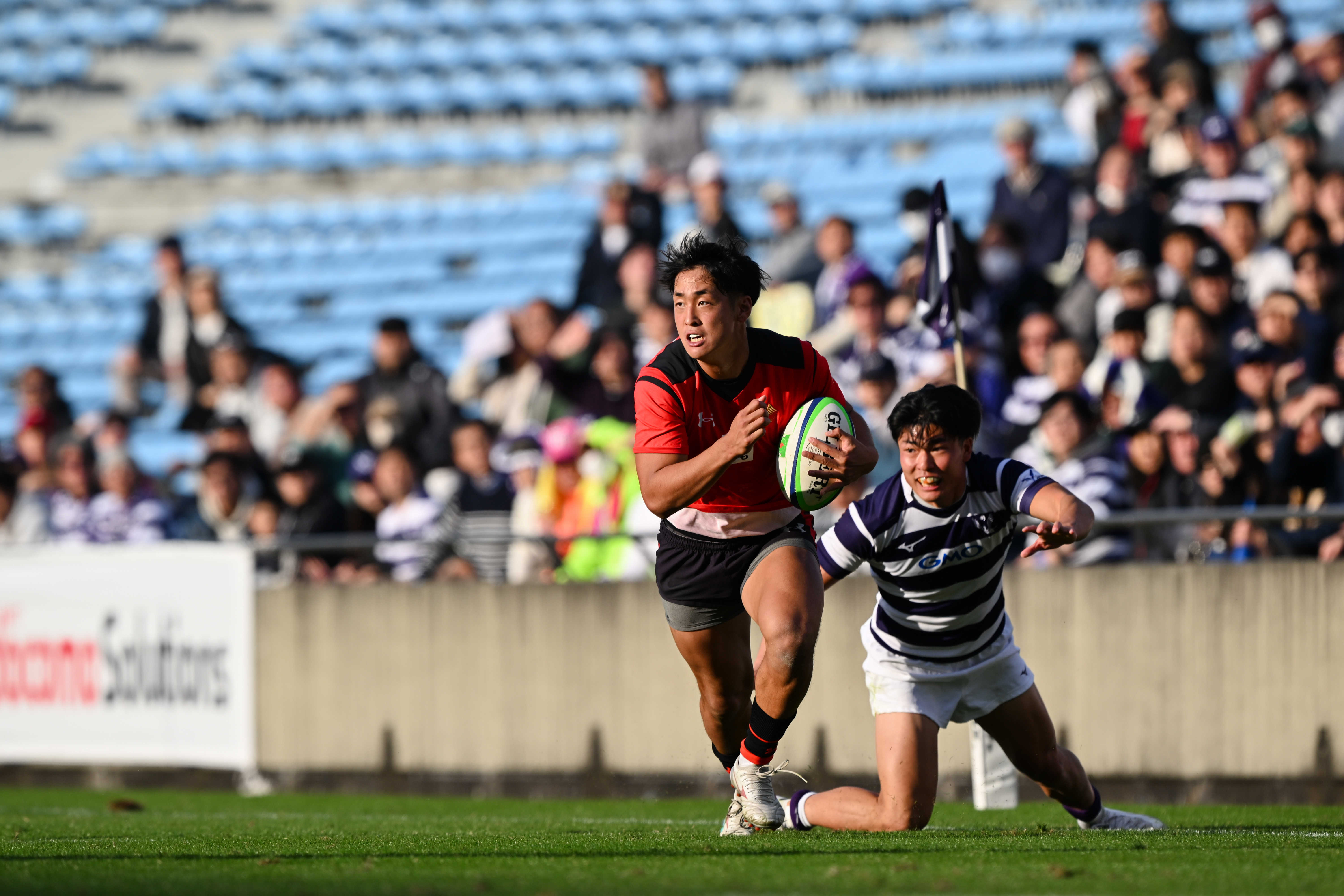 さらに激しい攻防が続く。40分、ラインアウトからフェーズを重ねる。ラックから、SH武智-SO本橋-CTB大町-WTB青栁-FLフィシプナと渡り、フィシプナが前進。さらに、青栁-FB吉田(琉)とパスし、吉田が抜け出してトライ(17-14)。ここで帝京が逆転した。