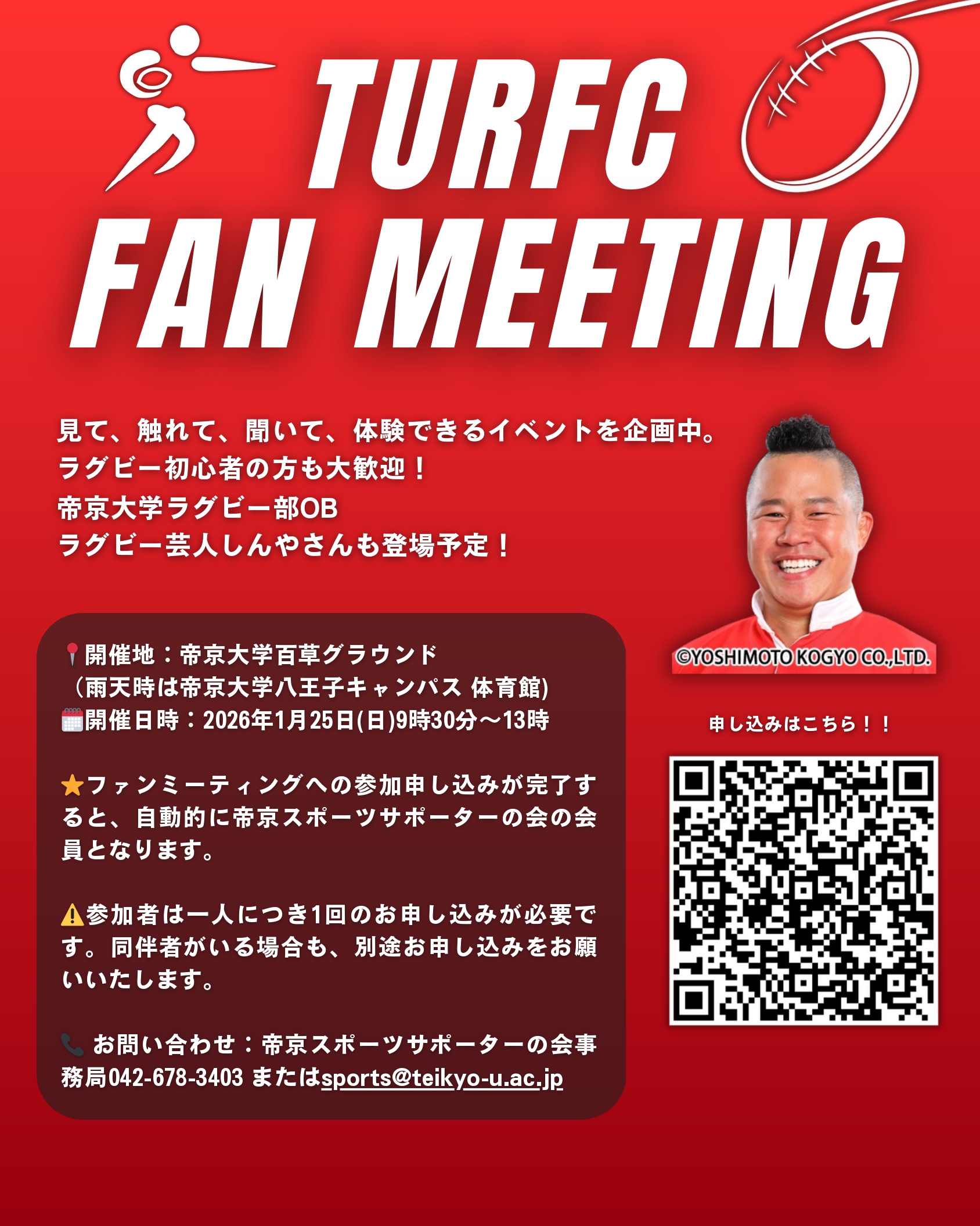 帝京大学ラグビー部OBの「ラグビー芸人 しんやさん」も登場予定