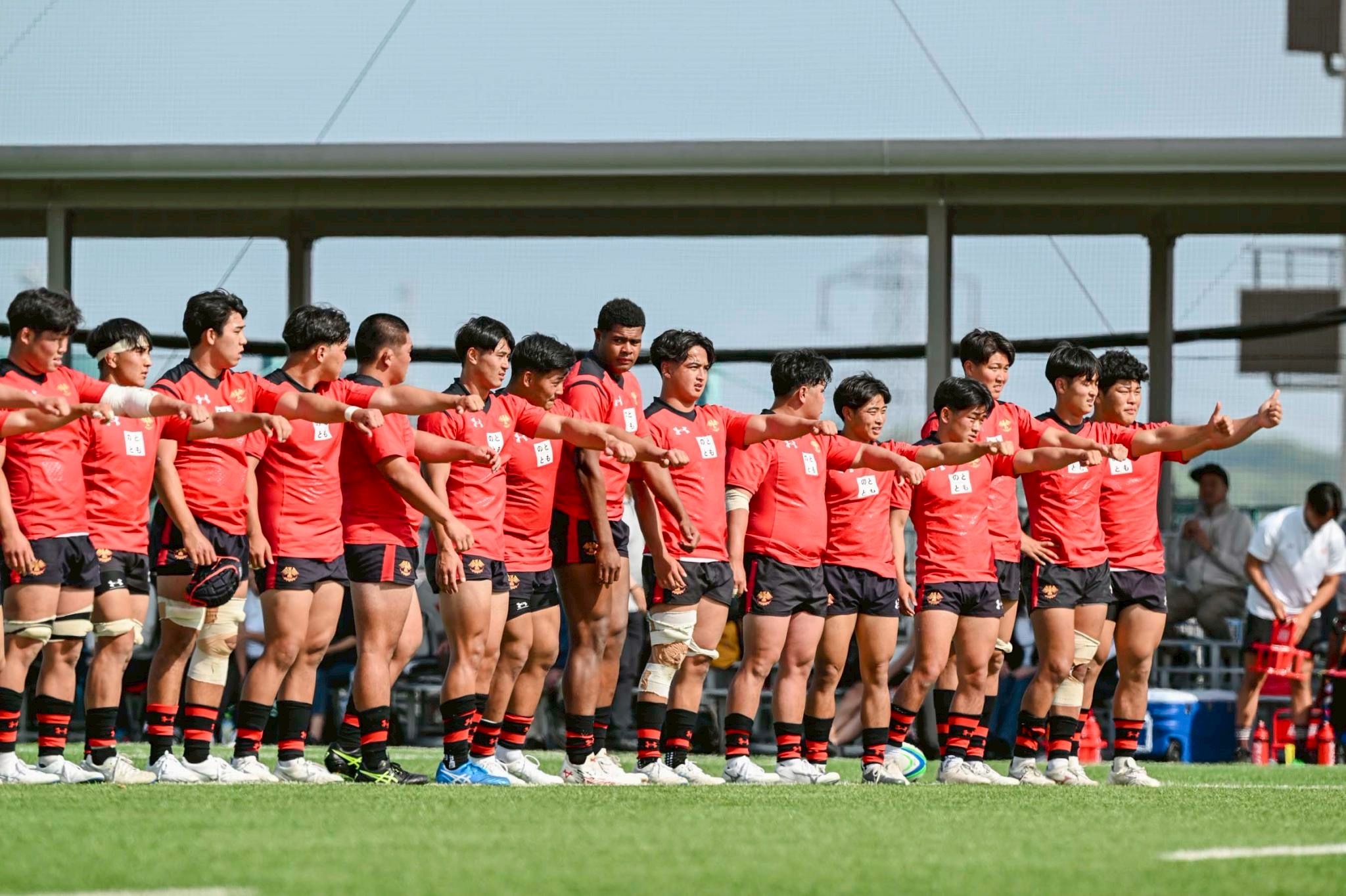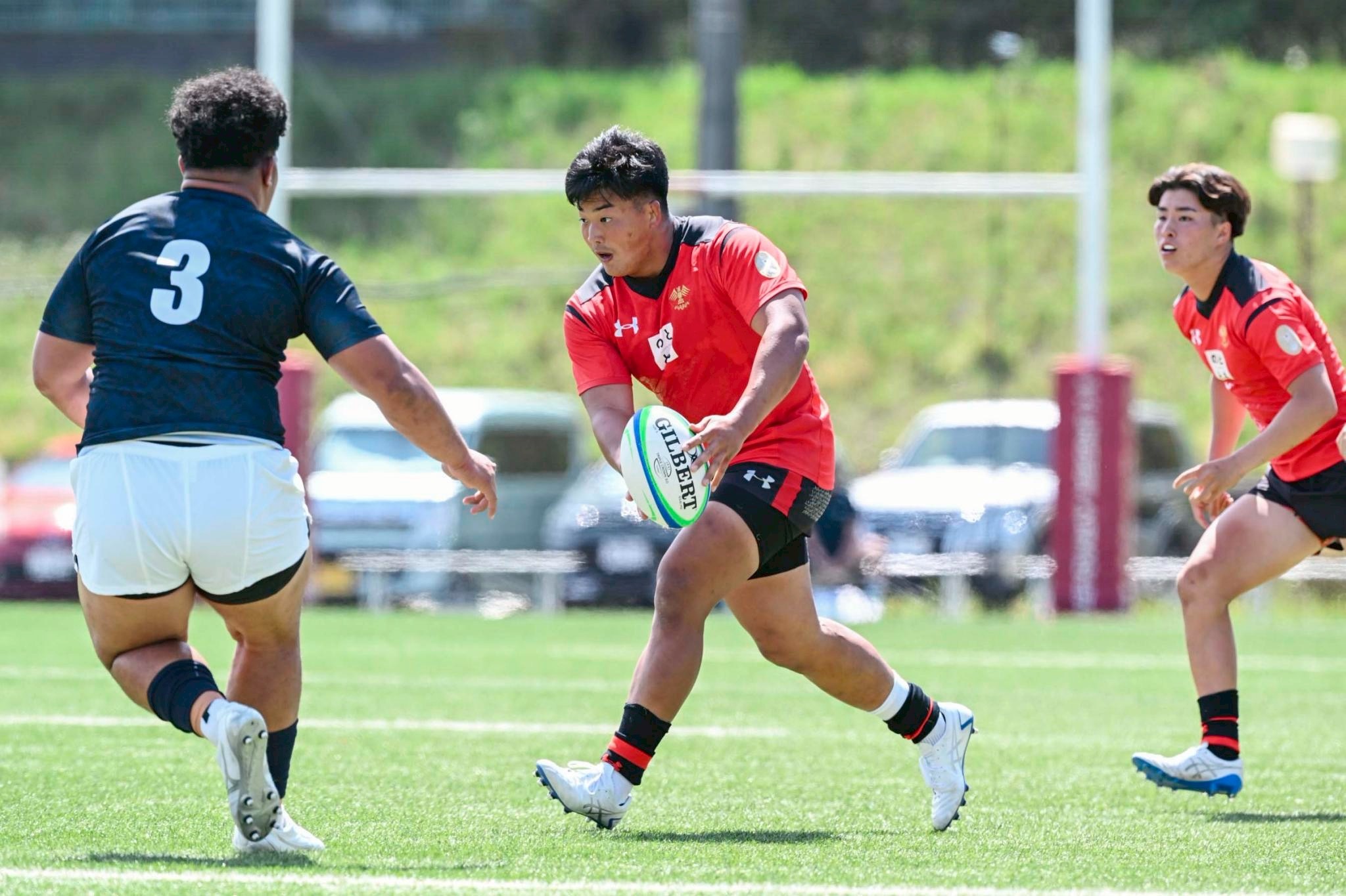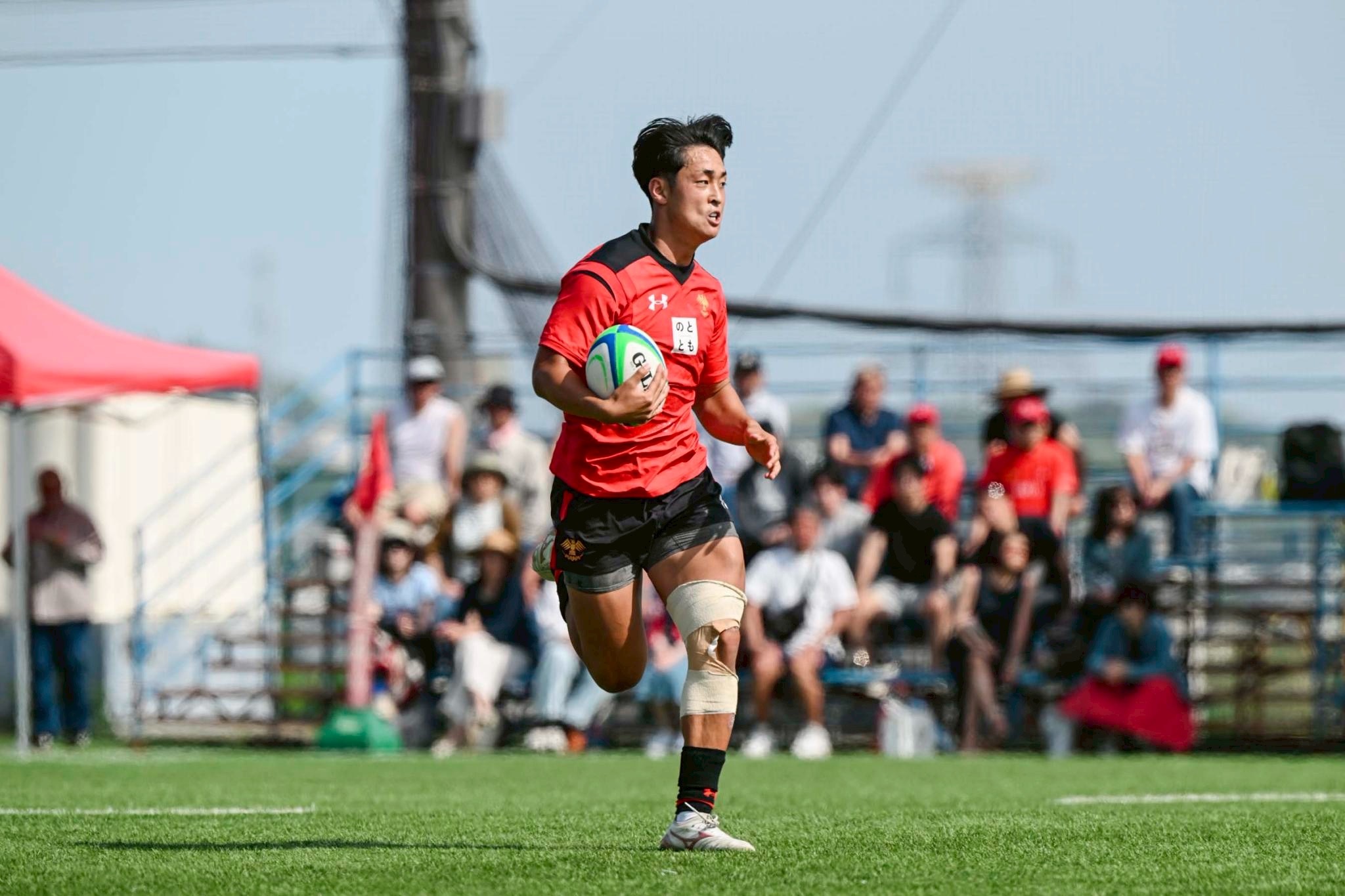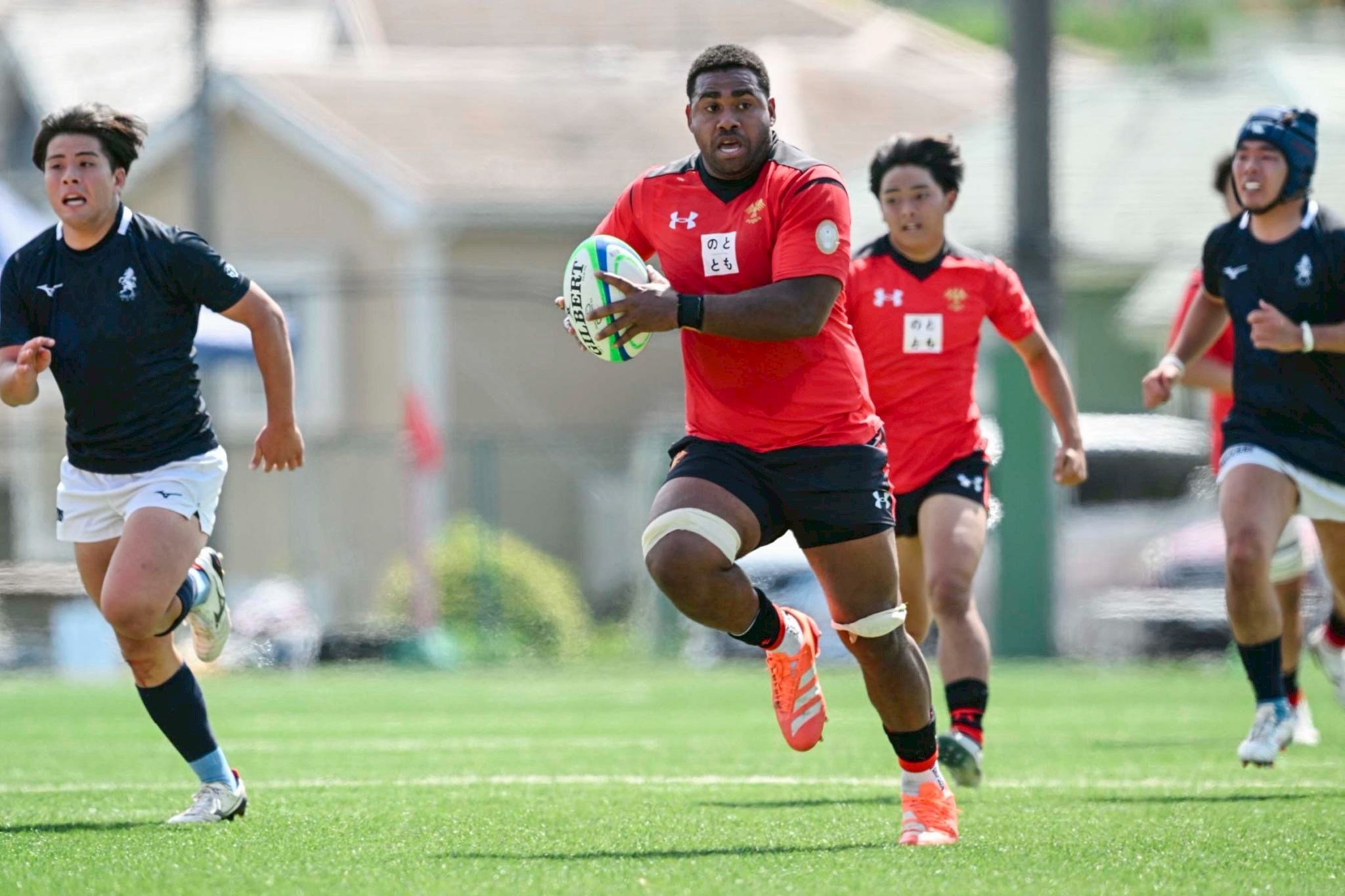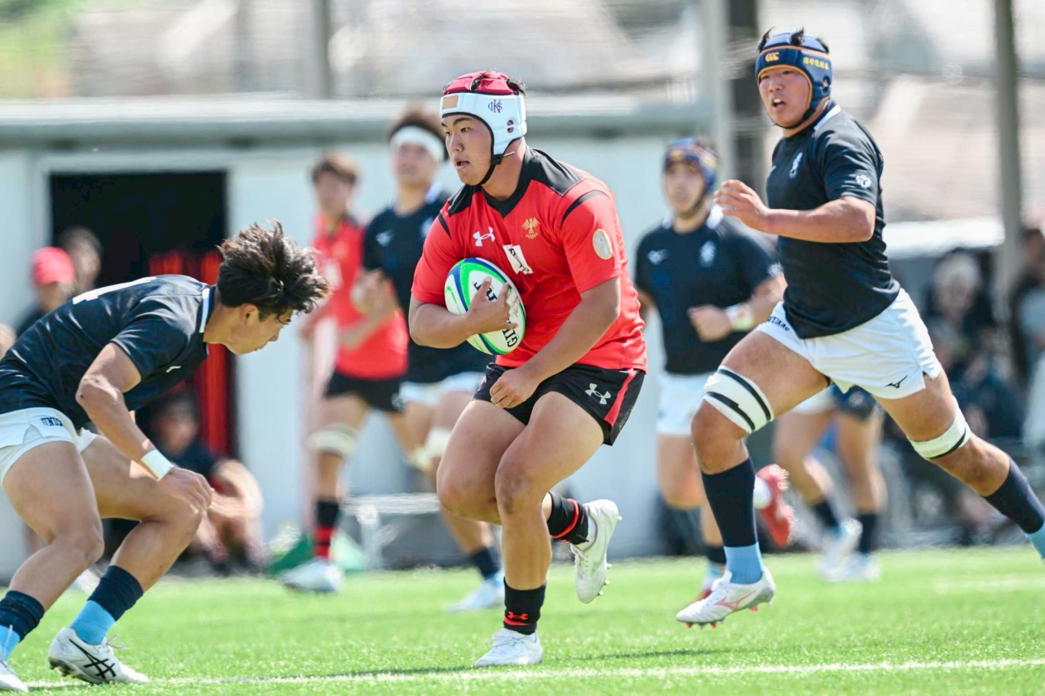 31分にはキックカウンターから連続攻撃。FL呉山、CTB関口が前進。ラックから、SH西村-PR森山-PR遠藤と渡り、遠藤がディフェンスをかいくぐってトライ(45-0)。36分、ラインアウトからモールを押し込み、LO服部がトライ(50-0)。39分にはラインアウトから連続攻撃。ラックから、SH西村-SO上田-No.8ダウナカマカマと渡り、ダウナカマカマが前進。さらにCTB齋藤へとパスし、齋藤が走り切ってトライ。