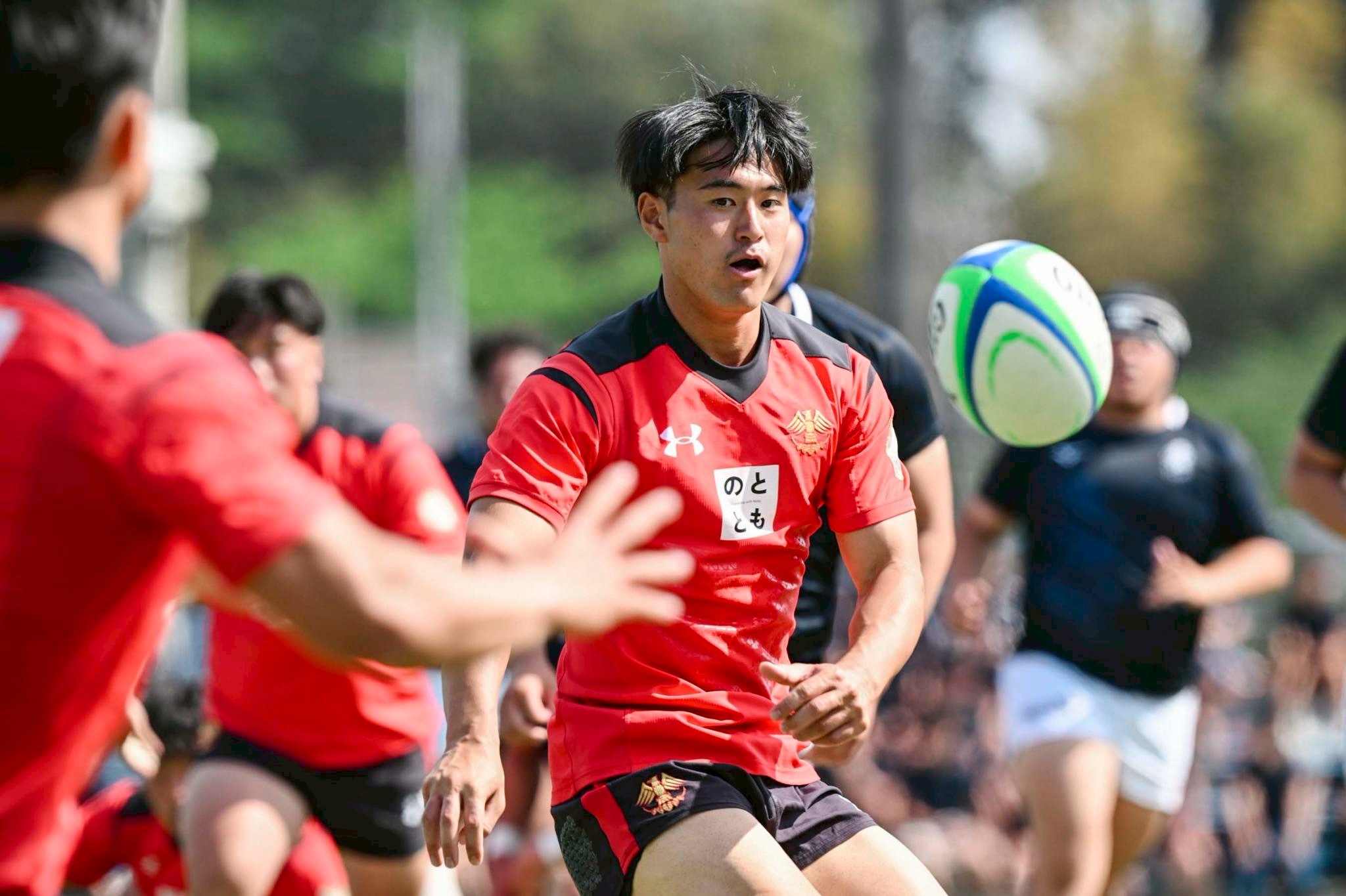 18分にはラインアウトからモールを押し込み、HO高がトライ(76-0)。27分、ラインアウトから連続攻撃。途中でパスが乱れるも、FB石原が拾って、CTB神田-CTB大嶋(柚)-WTB吉田-FL大司と渡り、大司が走り切ってトライ(81-0)。直後の29分には、キックオフから連続攻撃。SH飯沼のハイパントをWTB青栁がキャッチ。CTB神田-HO梶川-CTB神田と渡り、神田が走り切ってトライ(86-0)。
