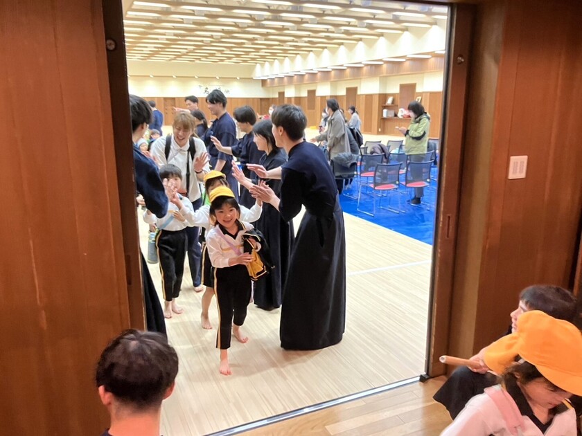 最後にまとめとして、竹刀に見立てた棒で新聞紙を切るゲーム感覚での競争を行い、見学している保護者からの大きな声援の中、剣道を楽しんでもらいました。
