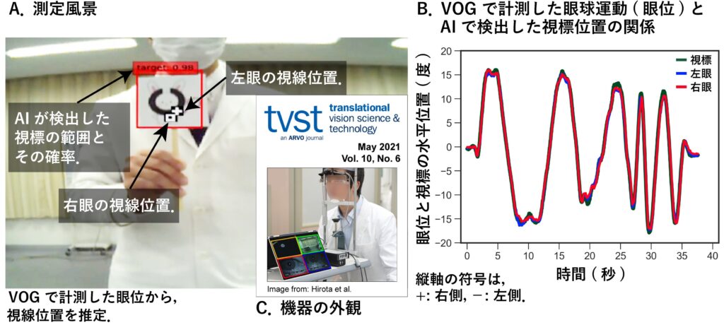 これまで,斜視の検査は,視能訓練士や医師が手で視標を動かし,患者さんの眼の動きを目視で判定していました.しかし,人が手動で行う方法は,検査する人の技量によって結果にばらつきが生じることが懸念されていました.そこで,我々の研究室では,眼球運動検査をデジタル化することを目標に,車の自動運転などで利用されている物体用の人工知能 (AI) に視標を認識させ,眼球運動をビデオカメラで記録する赤外線視線追跡装置 (video-oculography, VOG) と組み合わせた VOG-AI システムを開発しました.VOG-AI システムは 99.7% の確率で視標の位置を同定し (下図 A),眼球運動検査の結果を数値化することに成功しました (下図 B).