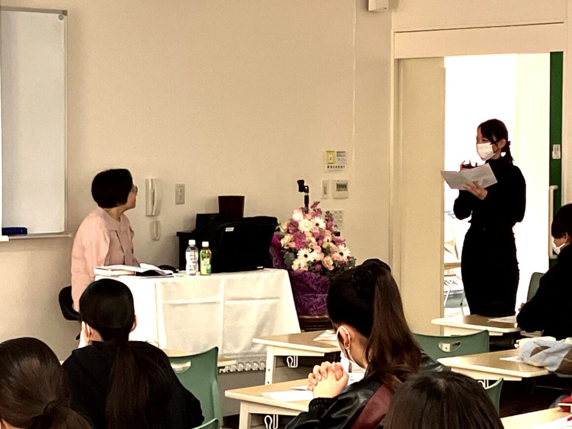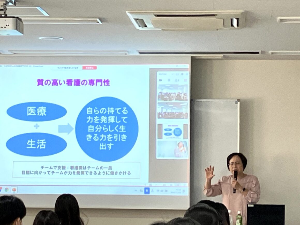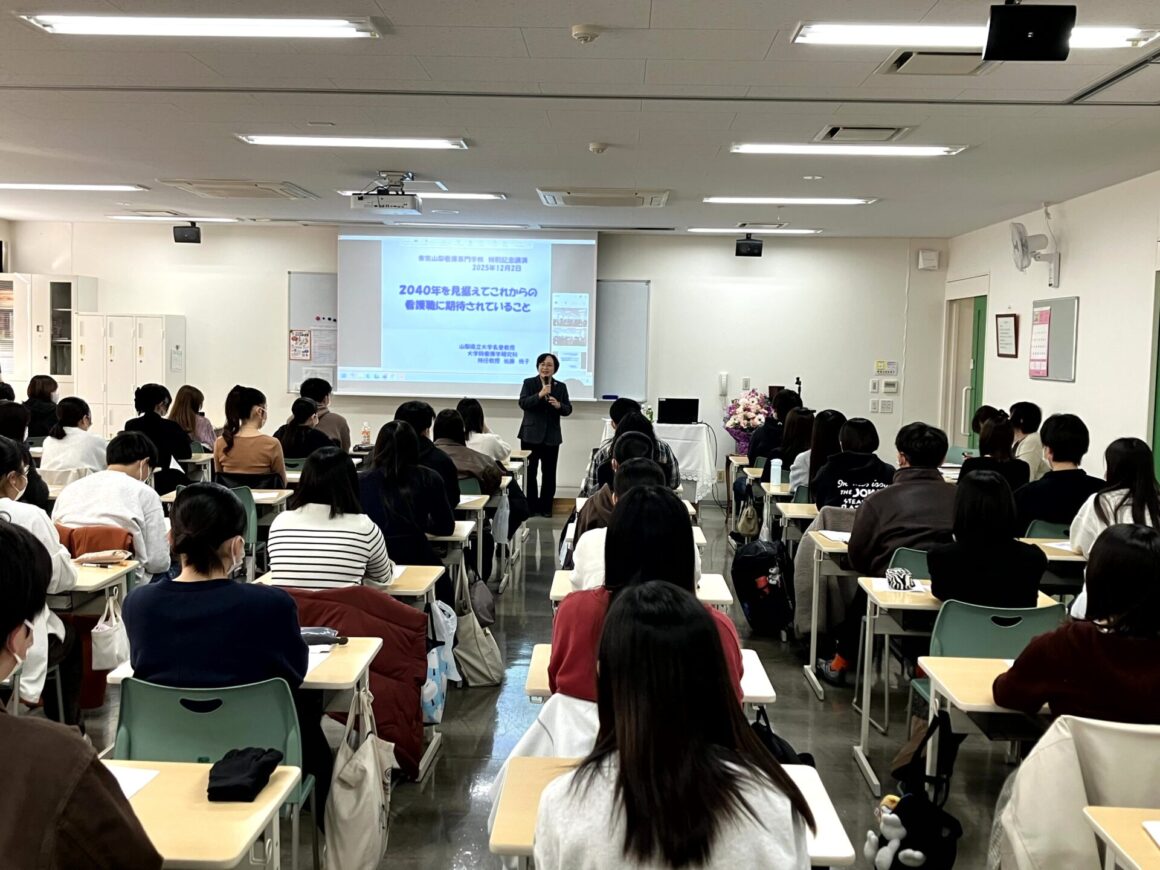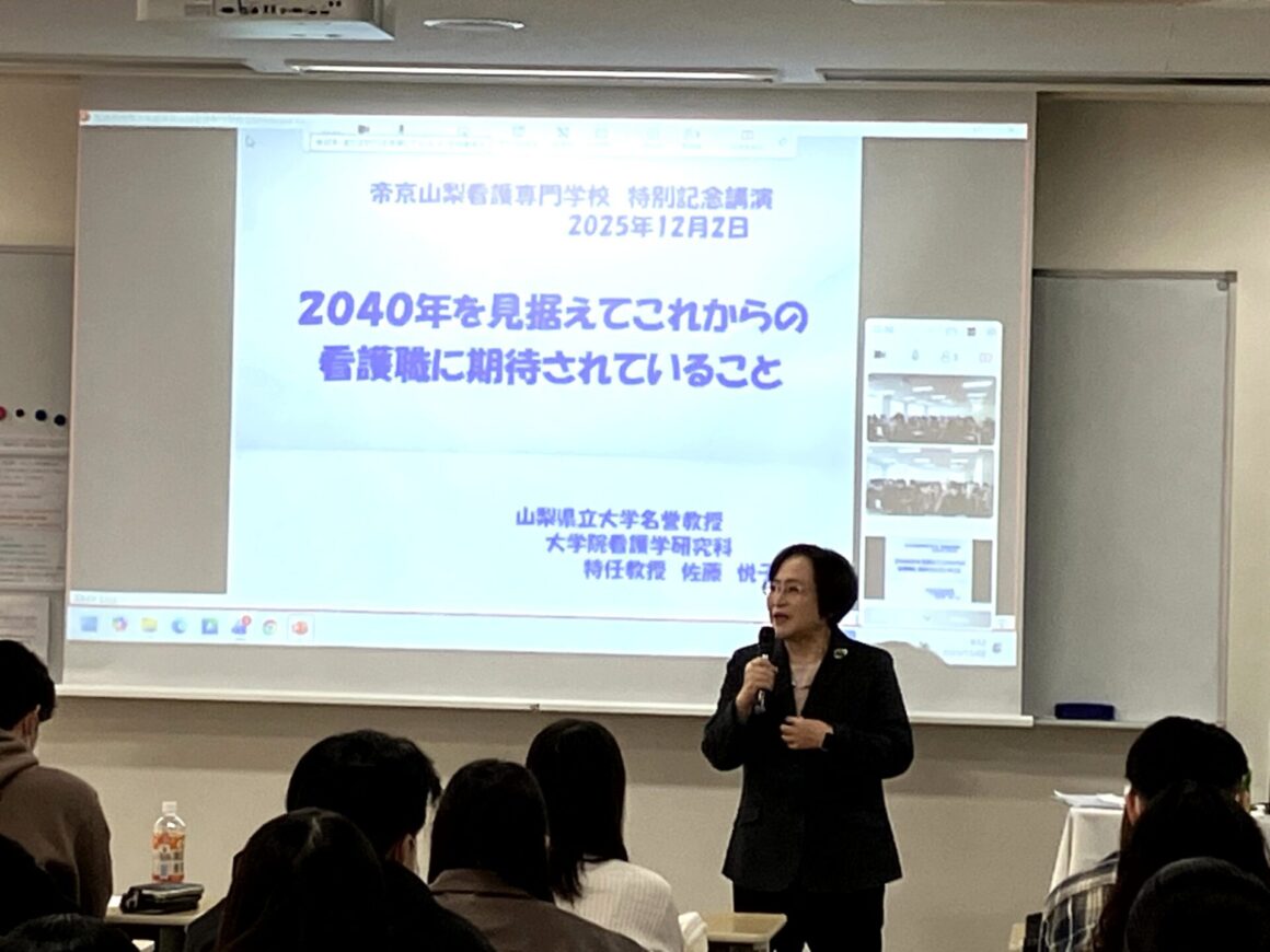 12月2日(火)午前中、特別記念講演を開催しました。 公益社団法人 日本看護協会 監事 佐藤悦子先生から「2040年を見据えてこれからの看護職に期待されること」というテーマでご講演いただきました。先生のお話は、目にしたことのあるデータにご自身の経験を重ね合わせることで、現在の保健・医療・福祉の実情をリアルに感じられる内容でした。また、積み重ねてこられた経験から看護への想いを語られ、「心身と生活を観る目を持ち、その人の持つ力を認めて引き出し高めることができる看護職の強みを活かして、その人らしさを支える看護師になってほしい」と力強いエールをいただきました。学生からは、「その人の持つ力を大切に看護していきたい」「無駄な体験は何一つないのでこれから様々な経験をしていきたい」など、先生の看護に取り組む真摯な姿勢に感化された言葉や表情がみられる、充実した講演会となりました。看護職の強みを自覚し、誇りをもって歩んでいきましょう!