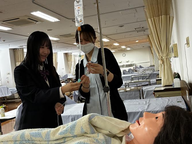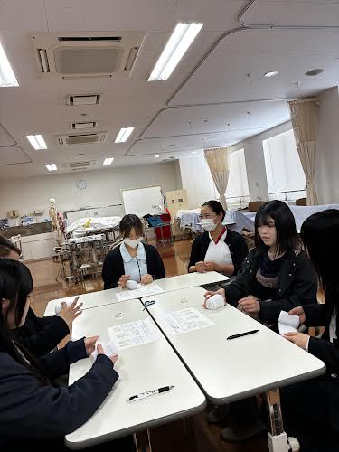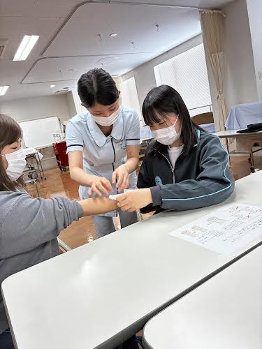 点滴の滴下合わせ、血圧測定、包帯法と様々な演習を在校生と楽しく学んでいただくことができました。次年度も、様々な企画を考えて皆さまのご参加お待ちしています!
